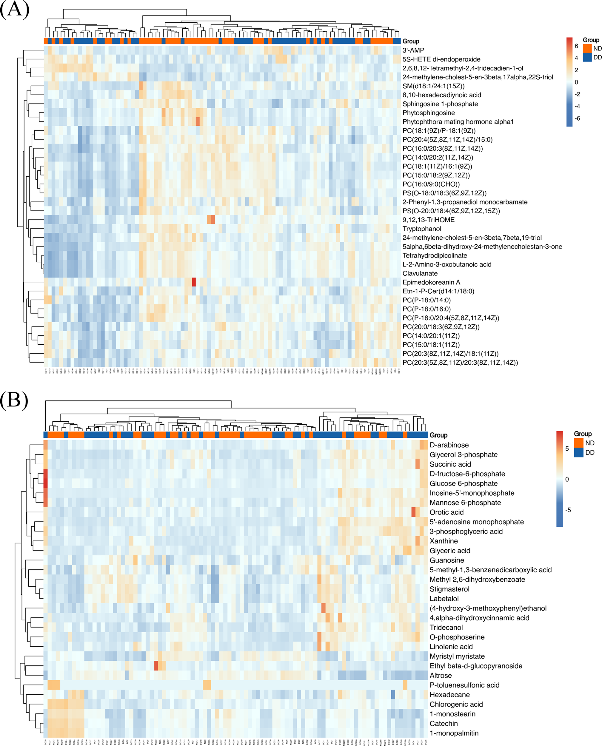 (A) LC-MS-based hierarchical clustering heatmap showing metabolite expression patterns for DD and ND groups. The color scale from blue to red represents increasing metabolite expression. (B) GC-MS-based hierarchical clustering heatmap showing similar clustering patterns as in (A), with a color scale indicating expression levels from low (blue) to high (red).