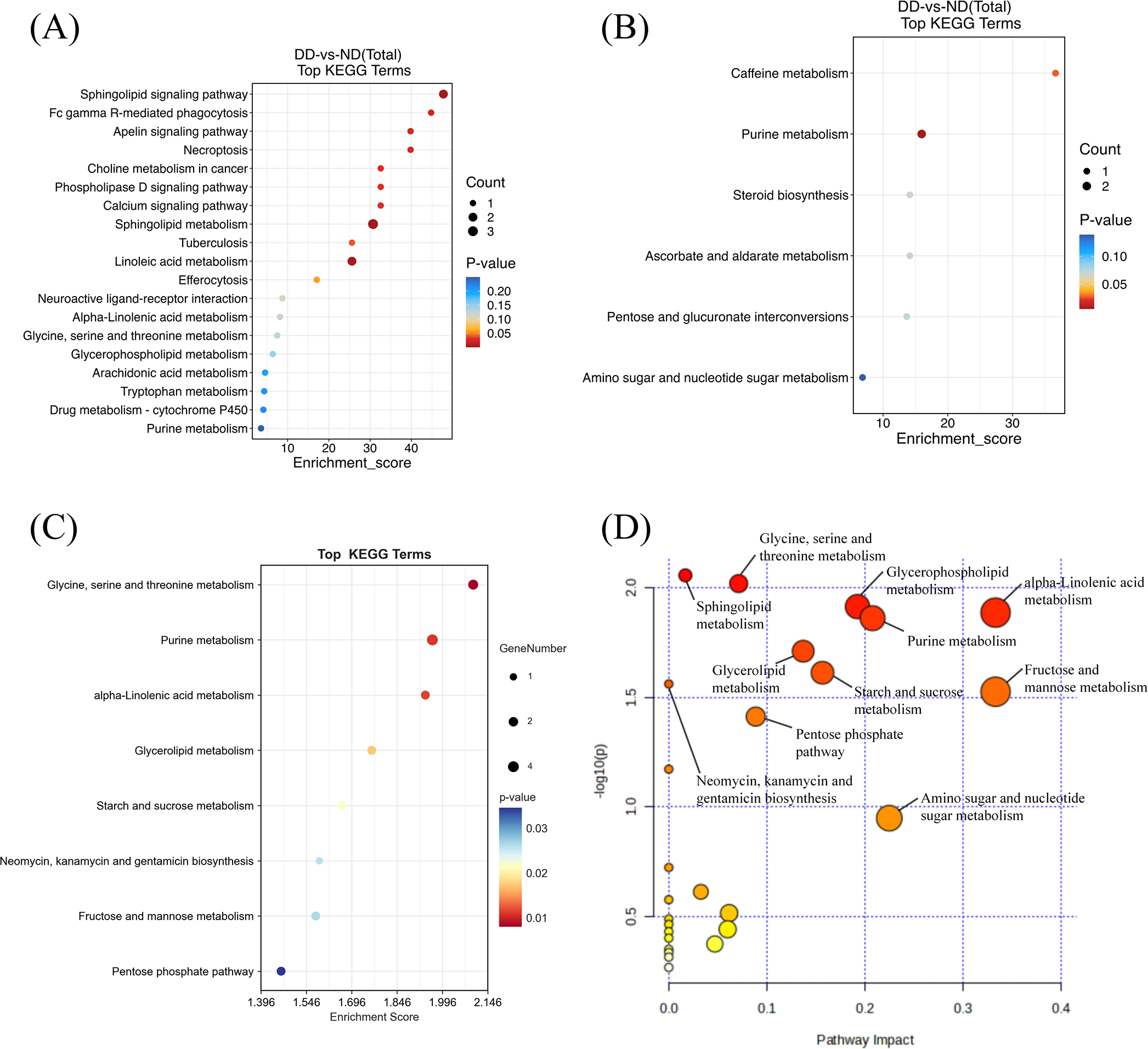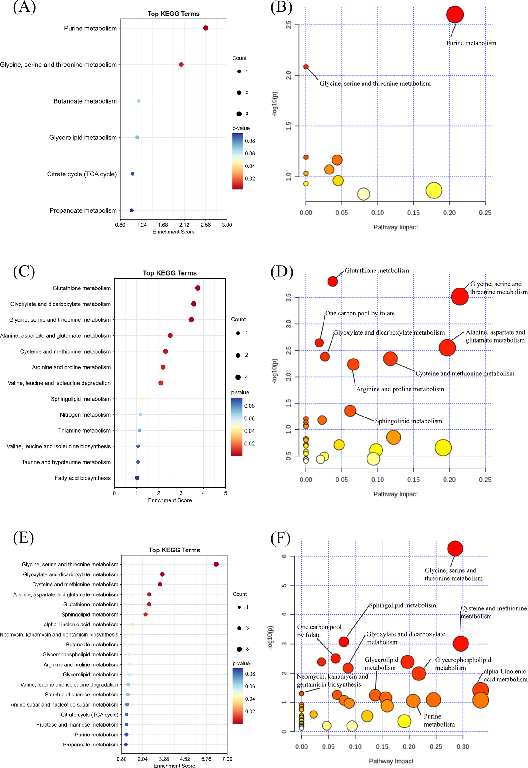Between-group differences were assessed using the OPLS-DA model in combination with the permutation test (200 times), with the following screening criteria: VIP>1.0 and p<0.05 (two-sided t-test). The Kyoto Encyclopedia of Genes and Genomes (KEGG) database (http://www.kegg.jp/kegg/pathway.html) was used for KEGG pathway enrichment analysis (Fisher’s exact test, FDR correction) to reveal significant metabolic pathways. Finally, the differential metabolites obtained from the LC-MS and GC-MS analyses were taken and pooled into a pool of highly related metabolites, and pathway enrichment analysis was performed with pathway analysis.
