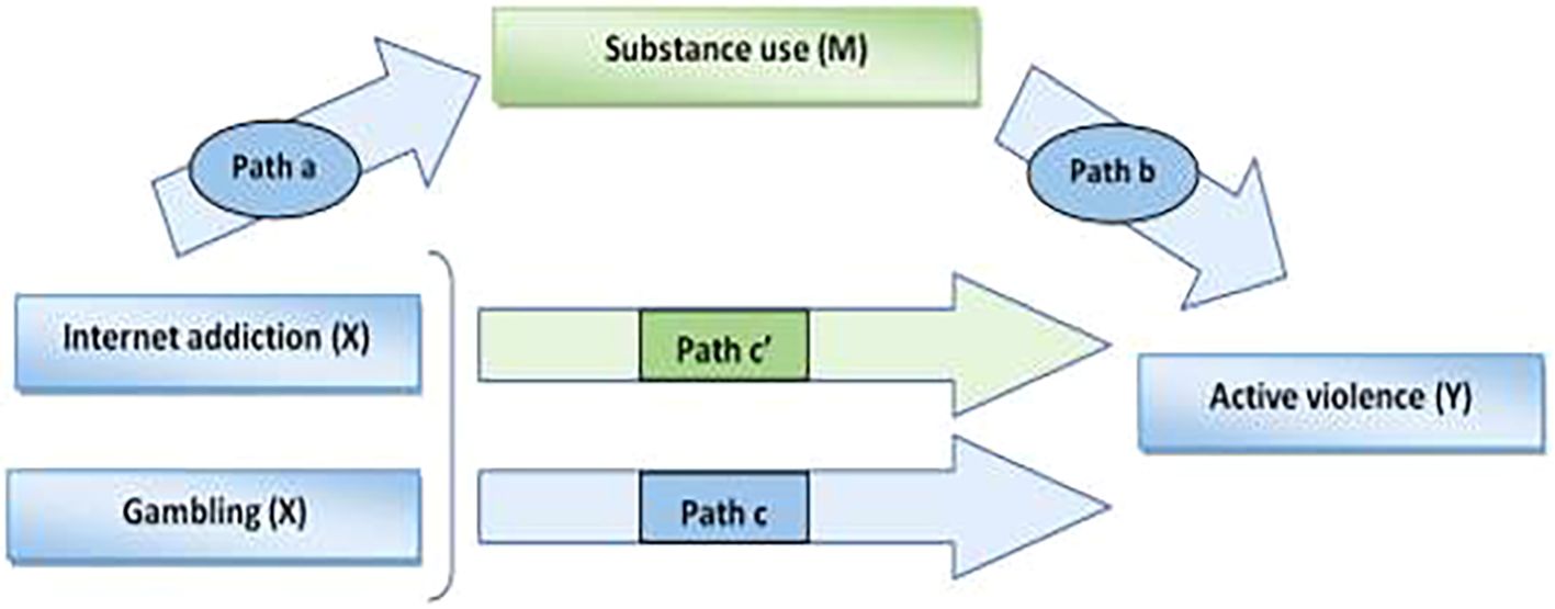 Methods: We performed a cross-sectional survey among schooled youth in the region of Mahdia in April 2023. We conducted a mediation analysis using in SPSS the PROCESS macro to examine the relationship between X (IA/Gambling), the mediator M (Substance use), and Y (Active violence). Causal interpretations cannot be definitively established. We used validated Arabic versions of the Internet Addiction Test, the South Oaks Gambling Screen Test, the CDC Health Appraisal section about substance use and the Hospital Anxiety and Depression Scale. We also probed violence perpetration. Data analyses were performed using SPSS version 20.