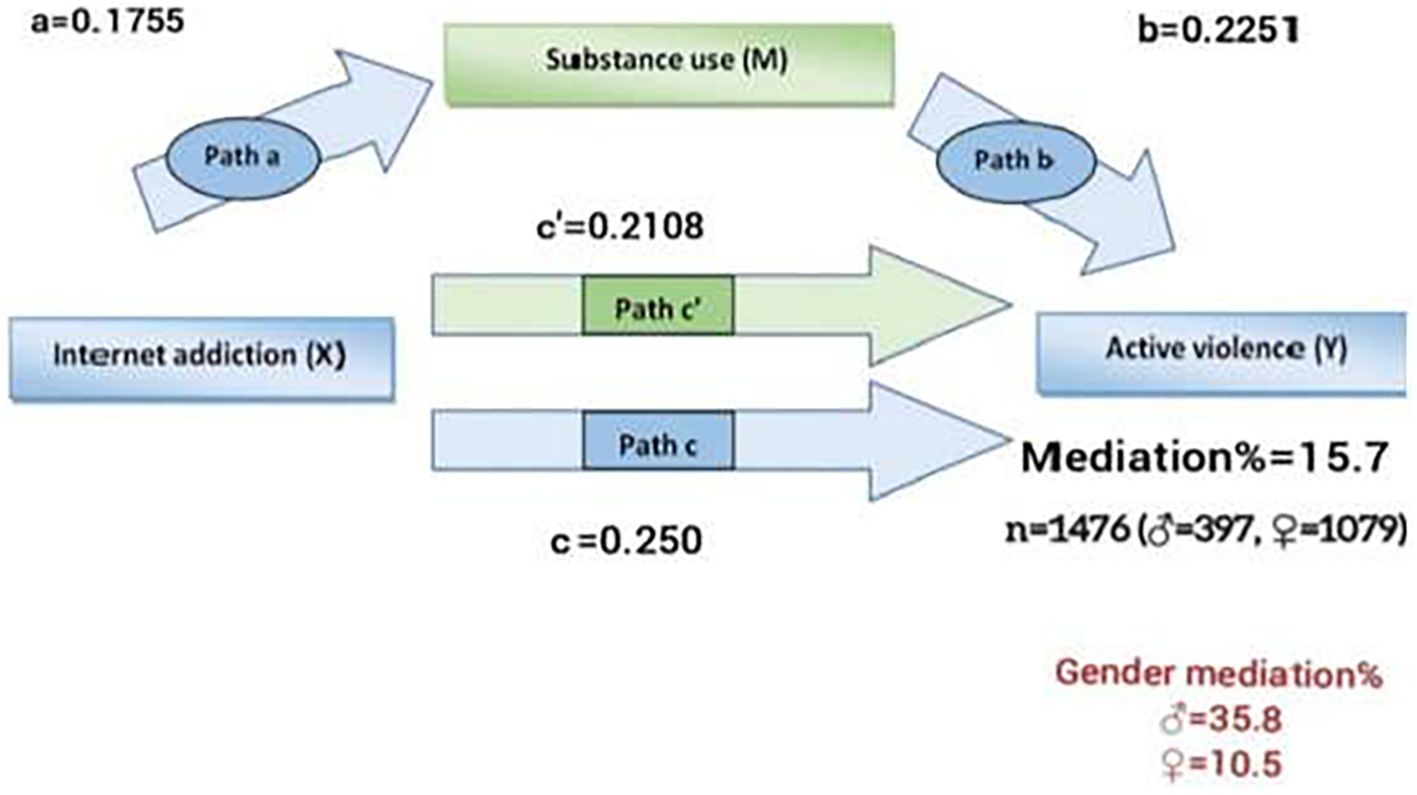 After accounting for anxiety and depression, substance use mediated the link between IA and active violence (mediation%= 15.7, p< 0.001) with a higher effect in males (35.8% vs 10.5%). The mediation between gambling and violence via substance use was also significant (28.2%, p < 0.001). This effect was found only among males (27.7%).