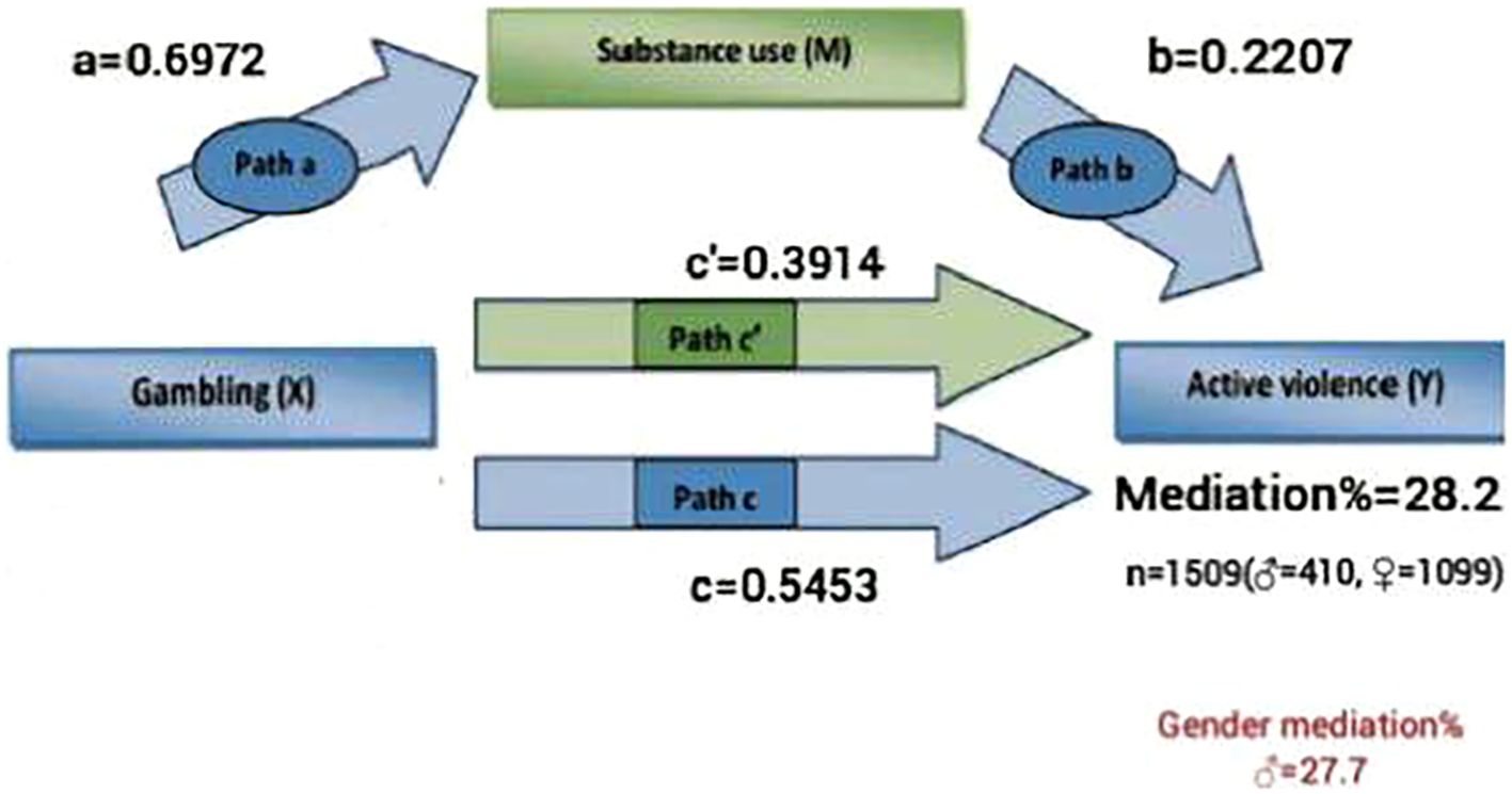 As shown in Figure 3, the total mediation effect of gambling on active violence via substance use was significant (mediation= 28.2%, p <0.001) when adjusting the mediation model for anxiety and depression. According to gender, the mediation effect was significant and reached 27.7% among males and no mediation effect was found for girls (Figure 3).