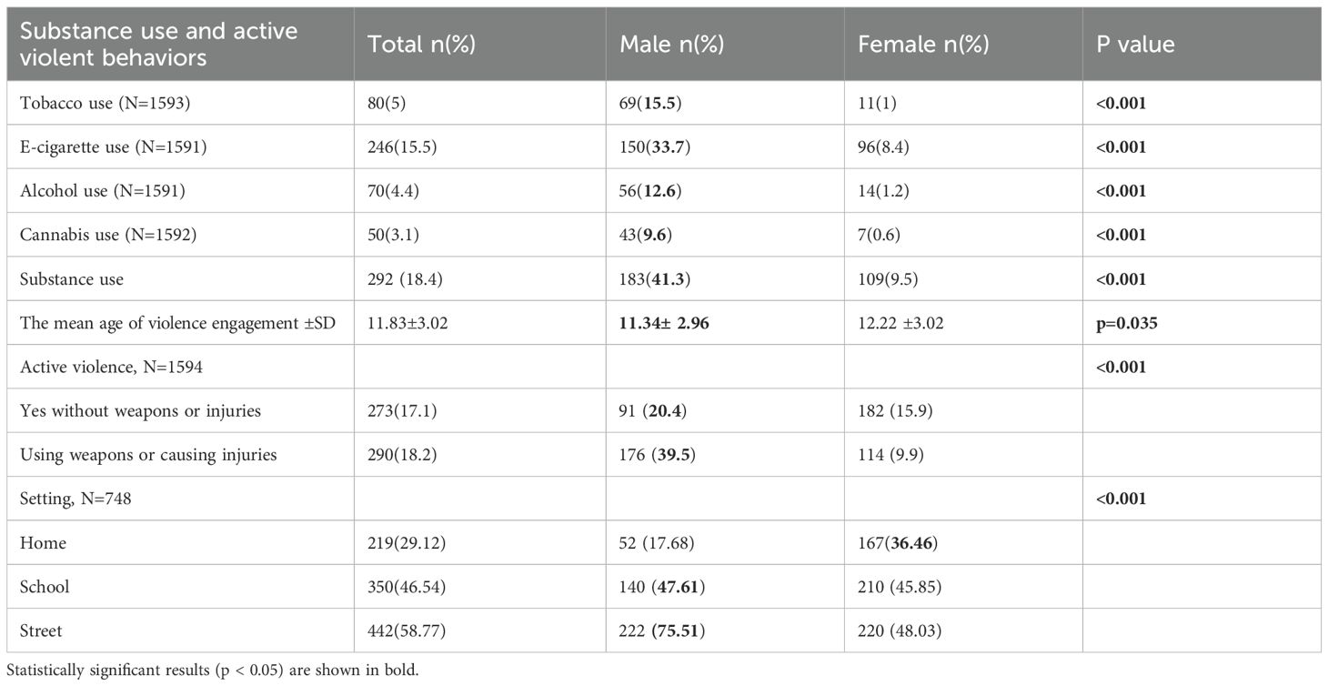 As shown in Table 1, substance use was reported in 18.4% of cases. According to gender, males were significantly more engaged. Engagement in active violence was reported by 35.3% of the sample. The average age at which participants reported their initial violent act was 11.83 ± 3.02 years. Using weapons or causing injuries were reported by 51.5% of students who were engaged in violent incidents.