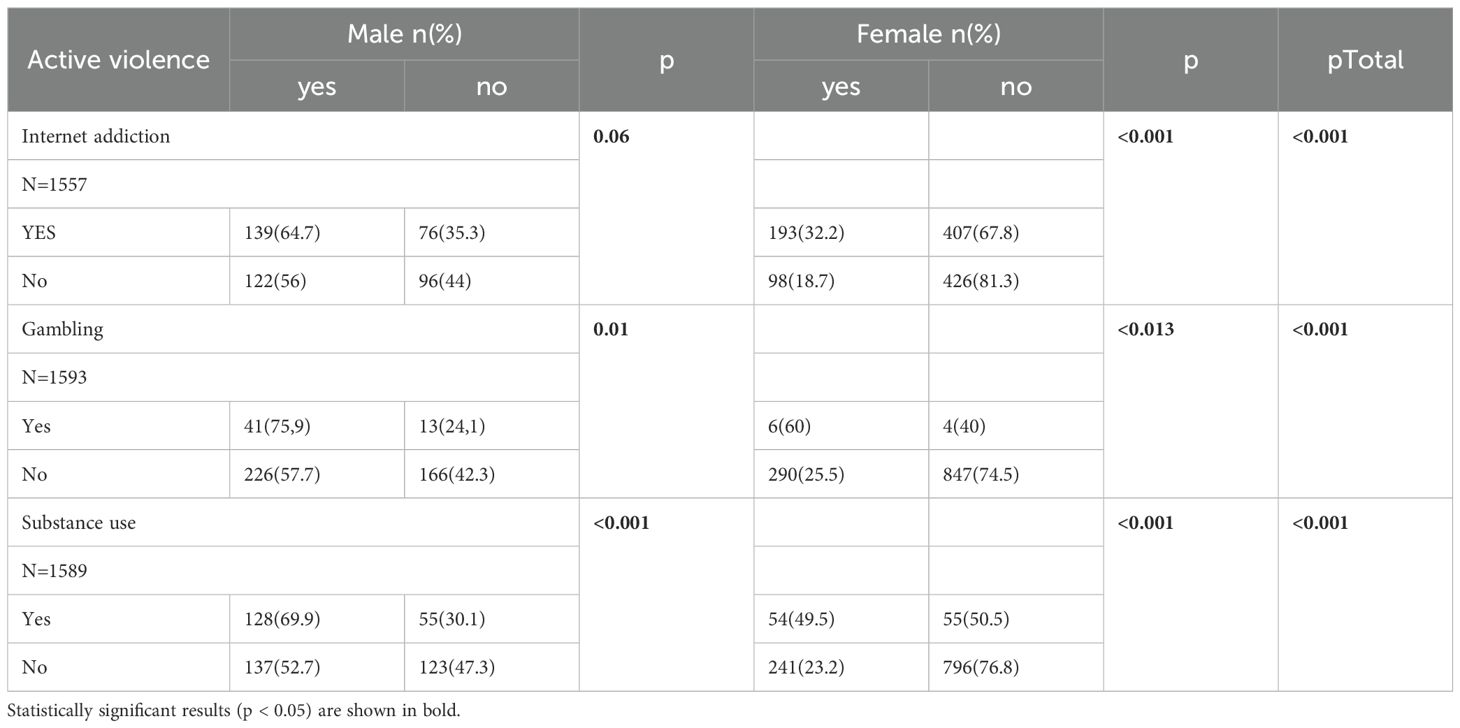 Conclusion: Implementing preventive strategies and focusing on addictive behaviors such as IA, gambling and substance use is urgently needed to prevent violence perpetration among youth. However, based on our results, the cross-sectional design limits causal interpretations.