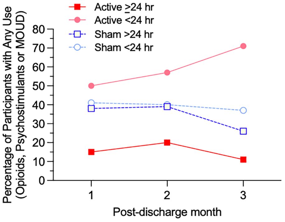 Rates of concurrent weekly use of opioids and psychostimulants (i.e. using both drugs at least once during the same post-discharge week) were numerically but not significantly lower in the Active group (2.4% concurrent use-weeks) than Sham (4.2%, Fisher’s exact test p = .192, two-tailed). Rates of concurrent weekly use were numerically but not significantly lower in the Active >24 hr group (1.0%) than Active <24 hr (3.8%, Fisher’s exact test p = .055, two-tailed) and significantly lower than Sham >24 hr (6.8%, Fisher’s exact test p = .002, two-tailed), but not significantly different than Sham <24 hr (2.6%, Fisher’s exact test p = .314, two-tailed).