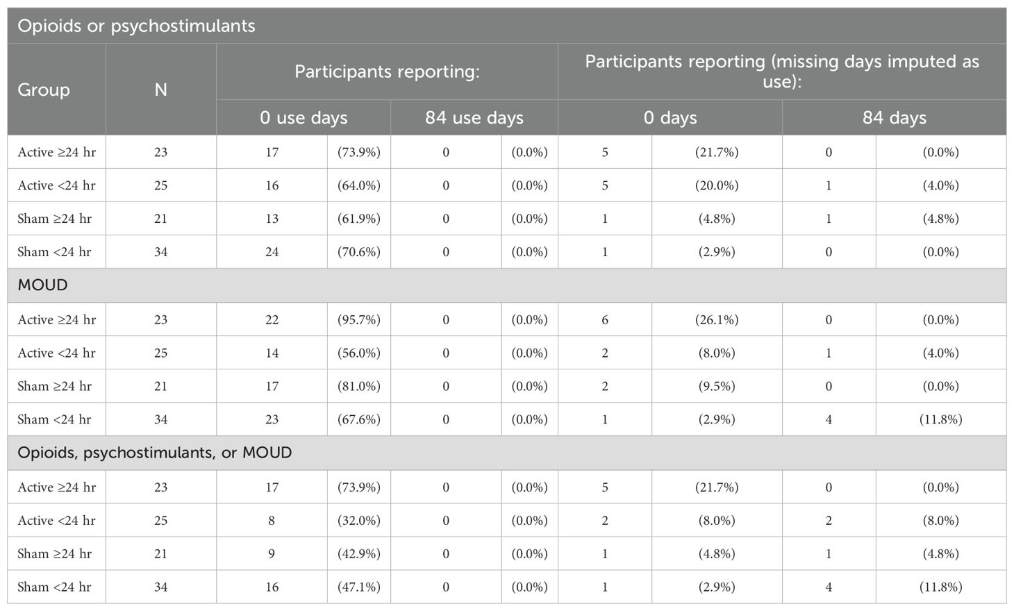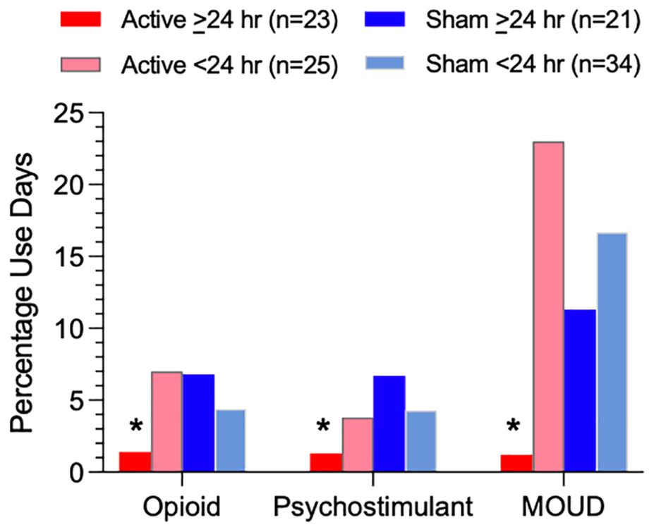 Results: Active and sham device groups reported similar rates of MOUD use and illicit opioid and psychostimulant use. In a planned secondary analysis, participants who self-administered active stimulation >24 hours (n = 23) compared to active <24 hours (n = 25), sham >24 hours (n = 21), and sham <24 hours (n = 34) reported significantly (p <.05) lower percentages of days using opioids (1.4% vs 7.4%, 6.8%, and 4.4% respectively) and psychostimulants (1.3% vs 4.1%, 6.7%, and 4.3% respectively) and MOUD (1.2% vs 20.7%, 11.3%, and 16.7% respectively).