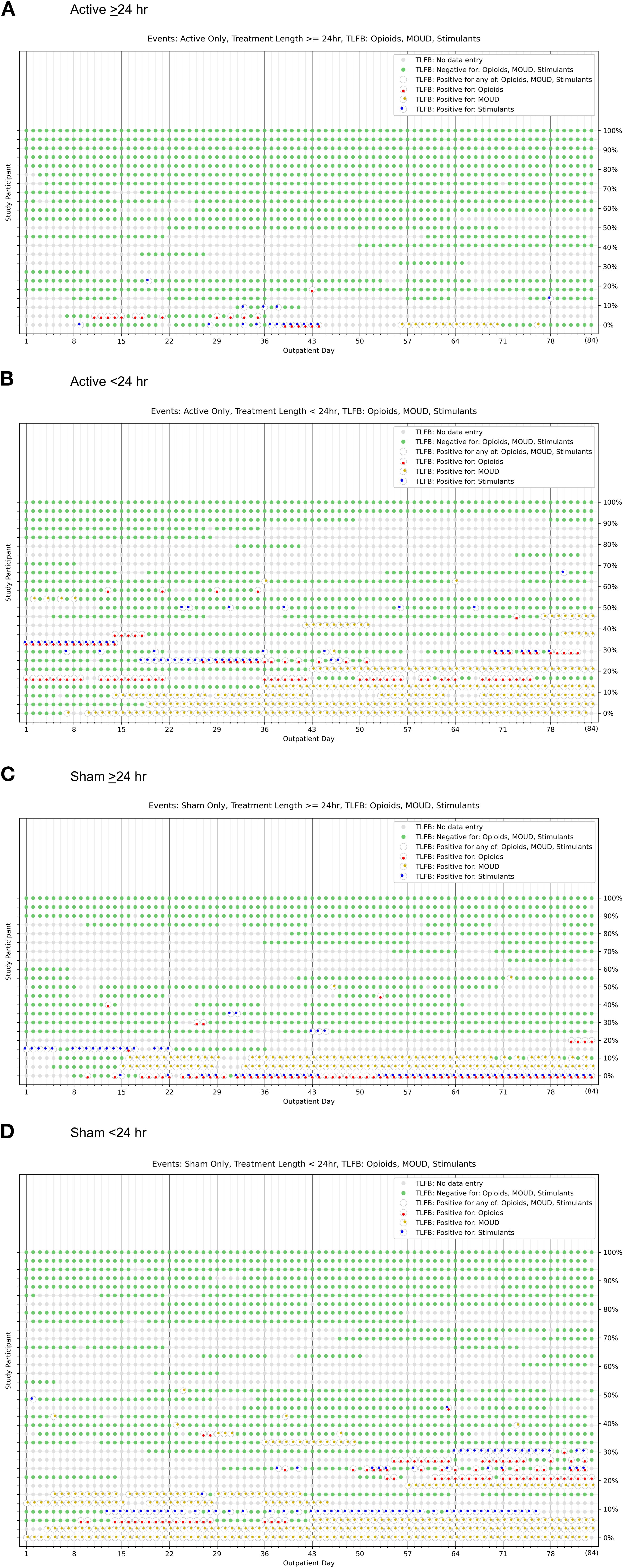 Figure 3 presents heat maps that depict individual-subject temporal patterns of post-discharge daily use of opioids, psychostimulants, and MOUD, and missing data, in each of the 4 residential treatment subgroups: (A) Active >24 hr, (B) Active <24 hr, (C) Sham >24 hr, and (D) Sham <24 hr. Individuals with higher quantities of non-use reports are clustered at the top and those with higher quantities of use reports are clustered at the bottom, facilitating visual comparison between the subgroups.