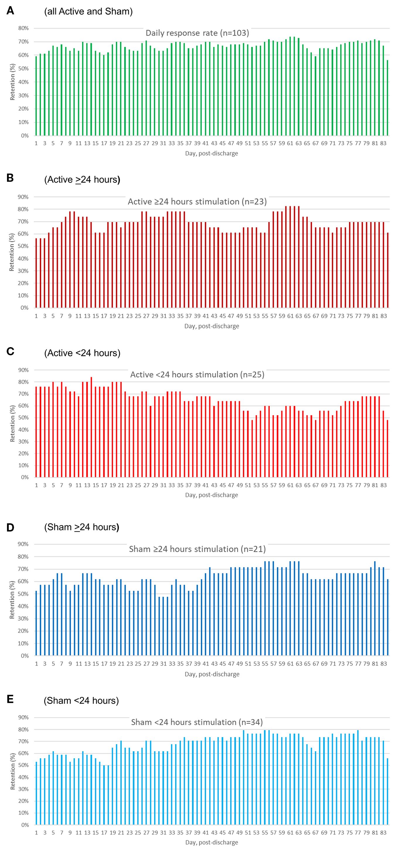 Figure 4. Percentage of participants reporting opioid, psychostimulant, and MOUD use data by day of follow-up. The different panels present the device utilization data separately for all patients (A), Active ≥24 hr (B), Active <24 hr (C), Sham ≥24 hr (D), and Sham <24 hr (E).