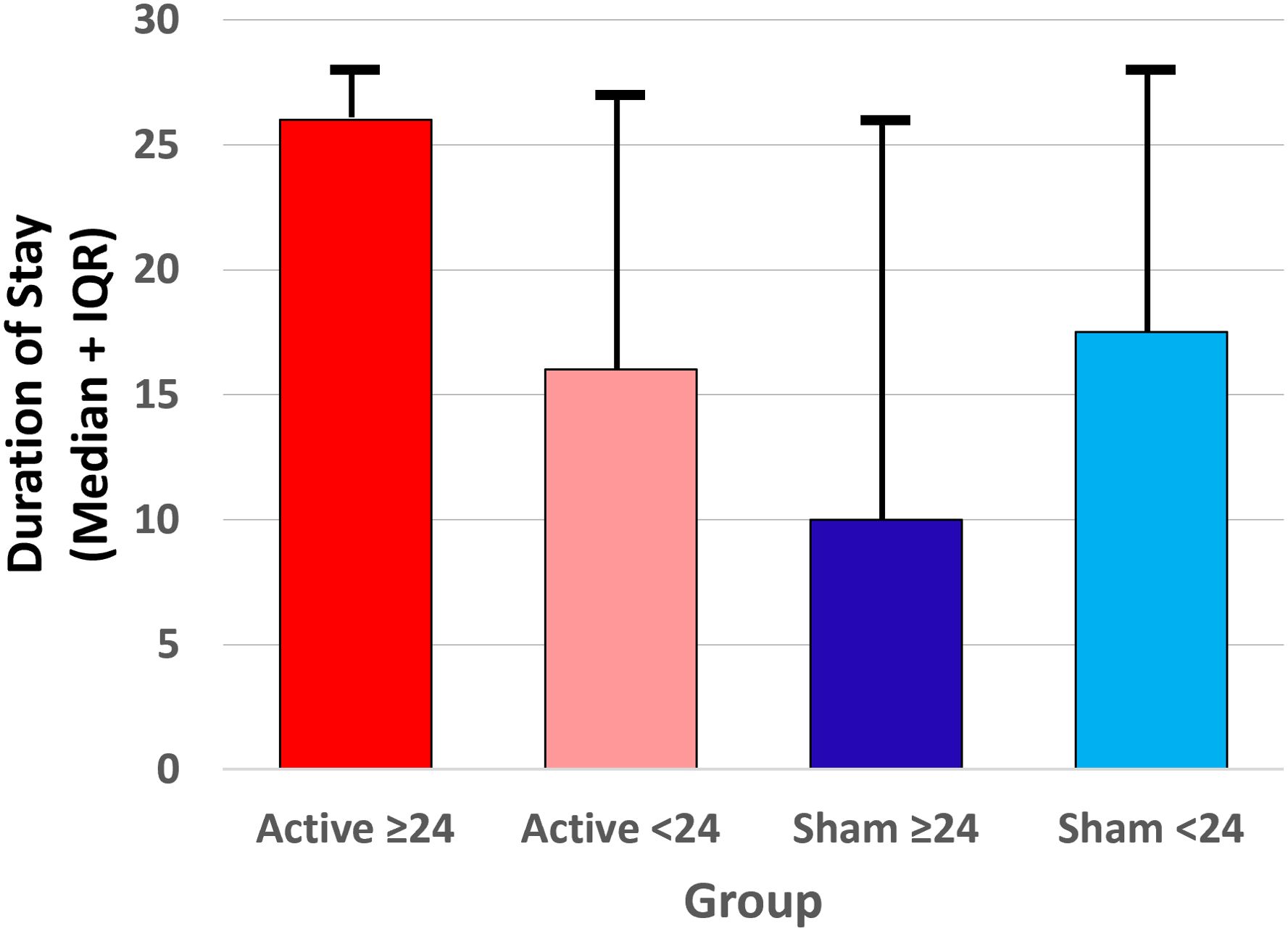 Figure 5. Median (interquartile range) duration of stay at the residential addiction treatment facility for each of the four subgroups (Active ≥24 hr, Active <24 hr, Sham ≥24 hr, and Sham <24 hr device utilization) prior to discharge.