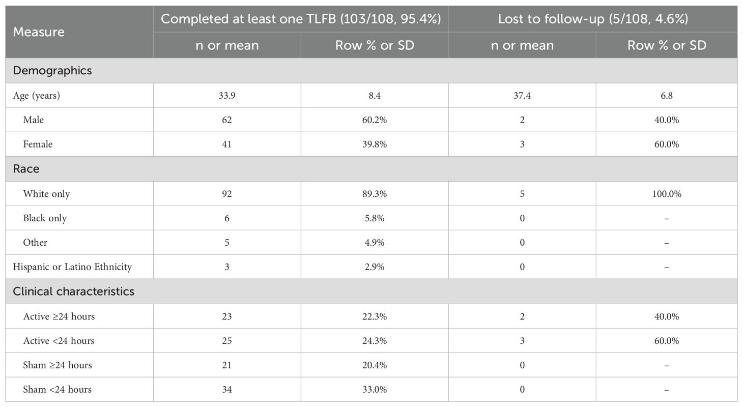 Table 1. Demographics and clinical characteristics of participants completing at least one timeline followback (TLFB) interview or lost to follow-up.