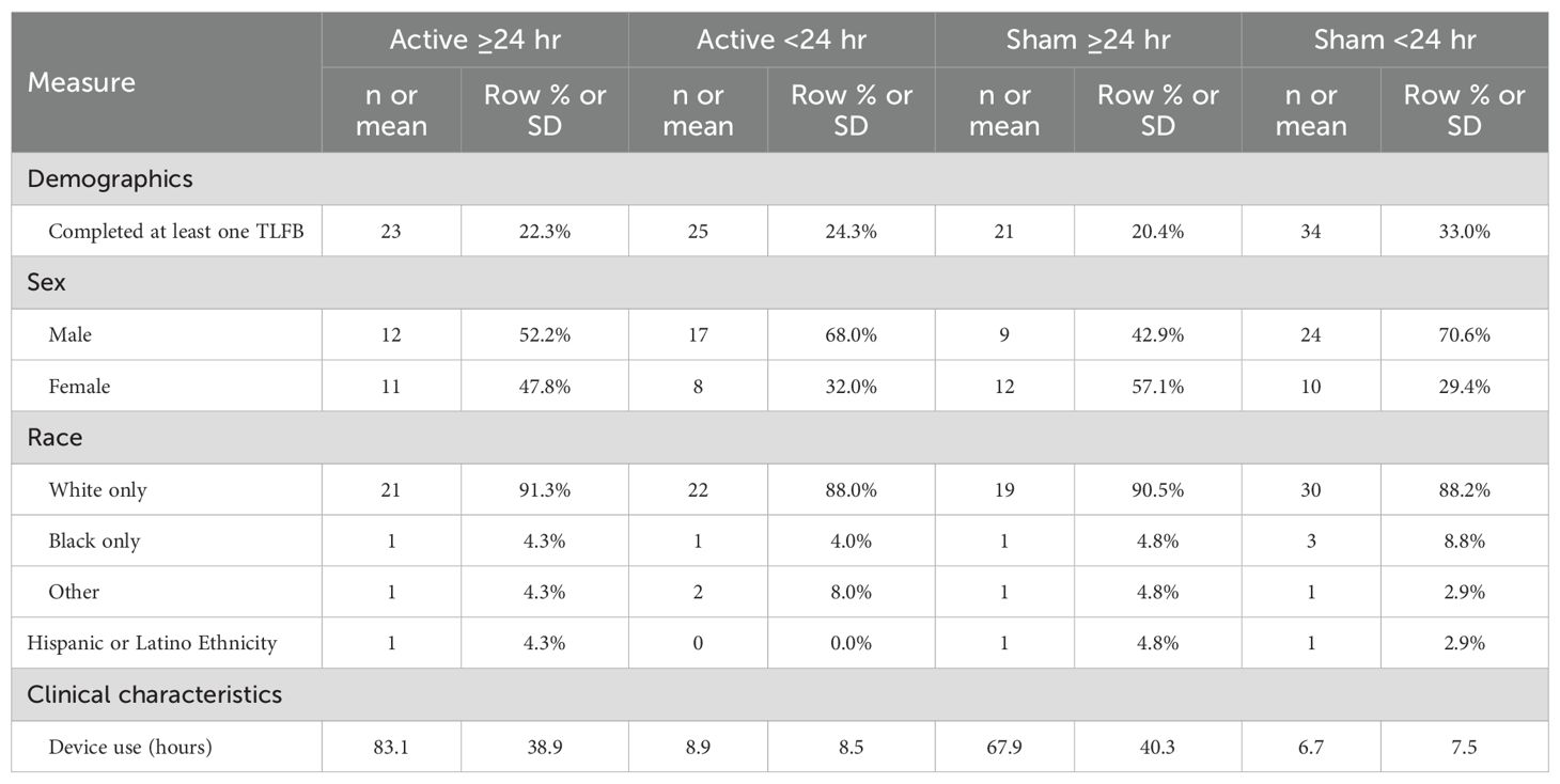 Additional measures included demographic (sex, age, race) and clinical variables (length of residential stay, primary substance use disorder), randomization group, and duration of device use (obtained from internal device statistic in 5-min intervals). Based on the observed non-normal distribution of duration of device use, this variable was dichotomized as >24 hr and <24 hr of device use leading to four groups to maximize numbers in each subgroup: Active >24 hr, Active <24 hr, Sham >24 hr, and Sham <24 hr.