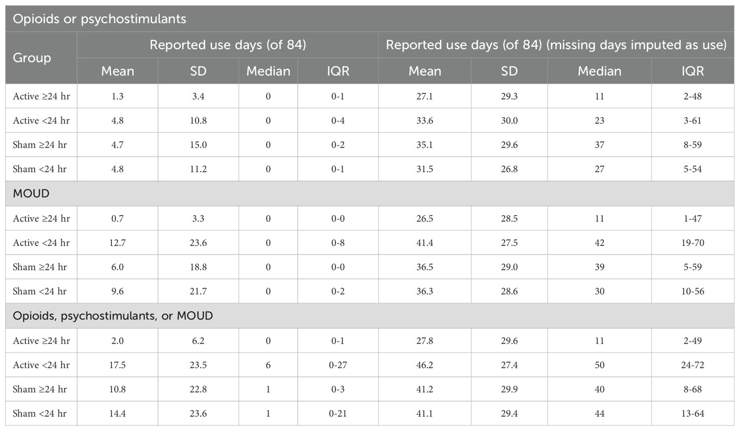 Table 3 lists percentages of patients with zero days of opioid or psychostimulant use (complete abstinence) during the 84-day post-discharge period for the four subgroups. Table 4 lists summary statistics for these groups. Data are presented with reported use-days and with missing values imputed as use. The percentage of participants with zero days of use was significantly higher in the Active >24 hr group (73.9%) compared to the other groups (Active <24 hr: 32.0%, Sham >24 hr: 42.9%, Sham <24 hr: 47.1%), χ2 = 8.97, p = .003.