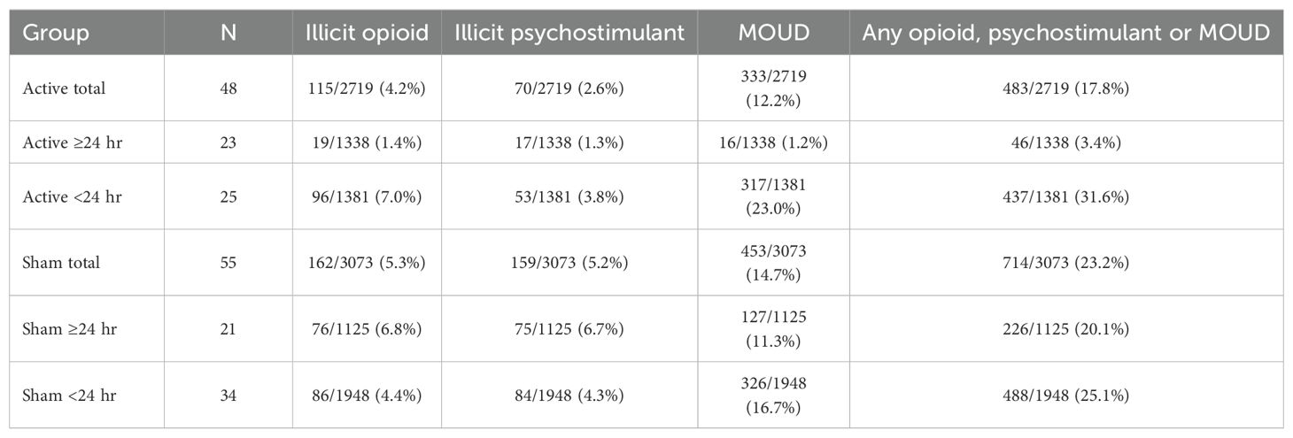 Figure 2 illustrates, and Table 5 lists, percentages of post-discharge reported person-days separately for illicit opioid, illicit psychostimulant, or MOUD use in the four groups. Rates of opioid use were significantly lower in the Active >24 hr group (1.4% use-days) compared to Active <24 hr (7.0% use-days), Sham >24 hr (6.8% use-days), or Sham <24 hr (4.4% use-days), χ2 = 51.33, 46.92 and 23.00, respectively, ps<.001, as were rates of psychostimulant use (Active >24 hr (1.3% use-days) compared to Active <24 hr (3.8% use-days), Sham >24 hr (6.7% use-days), or Sham <24 hr (4.3% use-days), χ2 = 17.86, 49.49 and 24.63, respectively, ps<.001. Rates of MOUD use were also significantly lower in the Active >24 hr group (1.2% use-days) compared to Active <24 hr (23.0% use-days), Sham >24 hr (11.3% use-days), or Sham <24 hr (16.7% use-days), χ2 = 299.37, 113.84 and 205.41 respectively, ps<.001, risk ratio from .106 to .052.