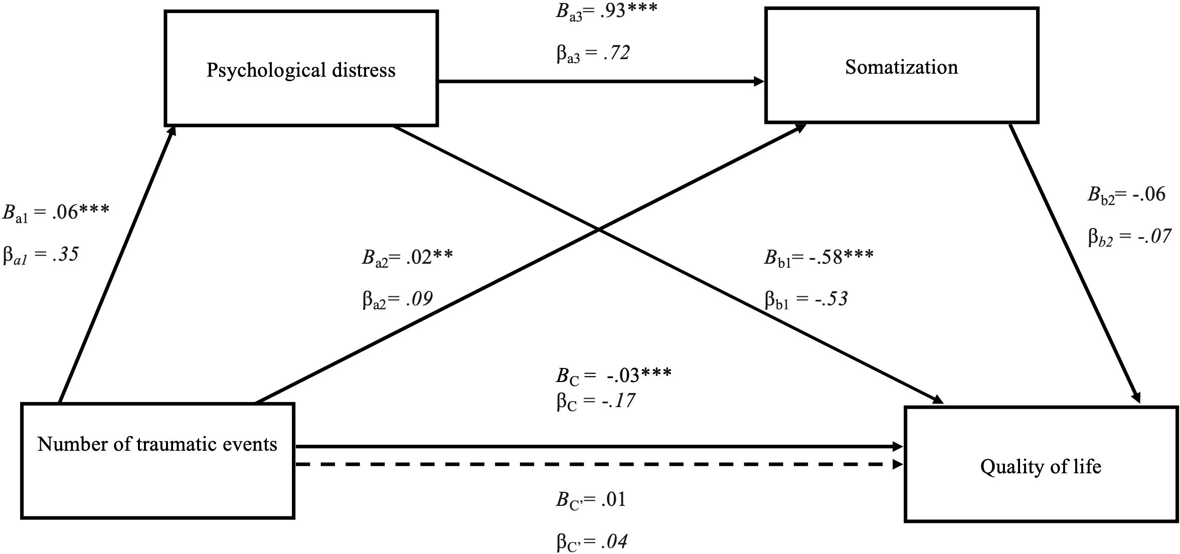 Figure 2. Serial mediation model of the effect of number of traumatic events on quality of life through somatization and psychological distress. The figure displays the serial multiple mediation of somatization and psychological distress in the relationship between the number of traumatic events and quality of life. Path coefficients are presented as unstandardized (B) and standardized (β) values. The total effect (C) and direct effect (C′) of the number of traumatic events and quality of life are also shown. *p <.05, **p < 0.01, ***p < 0.001.