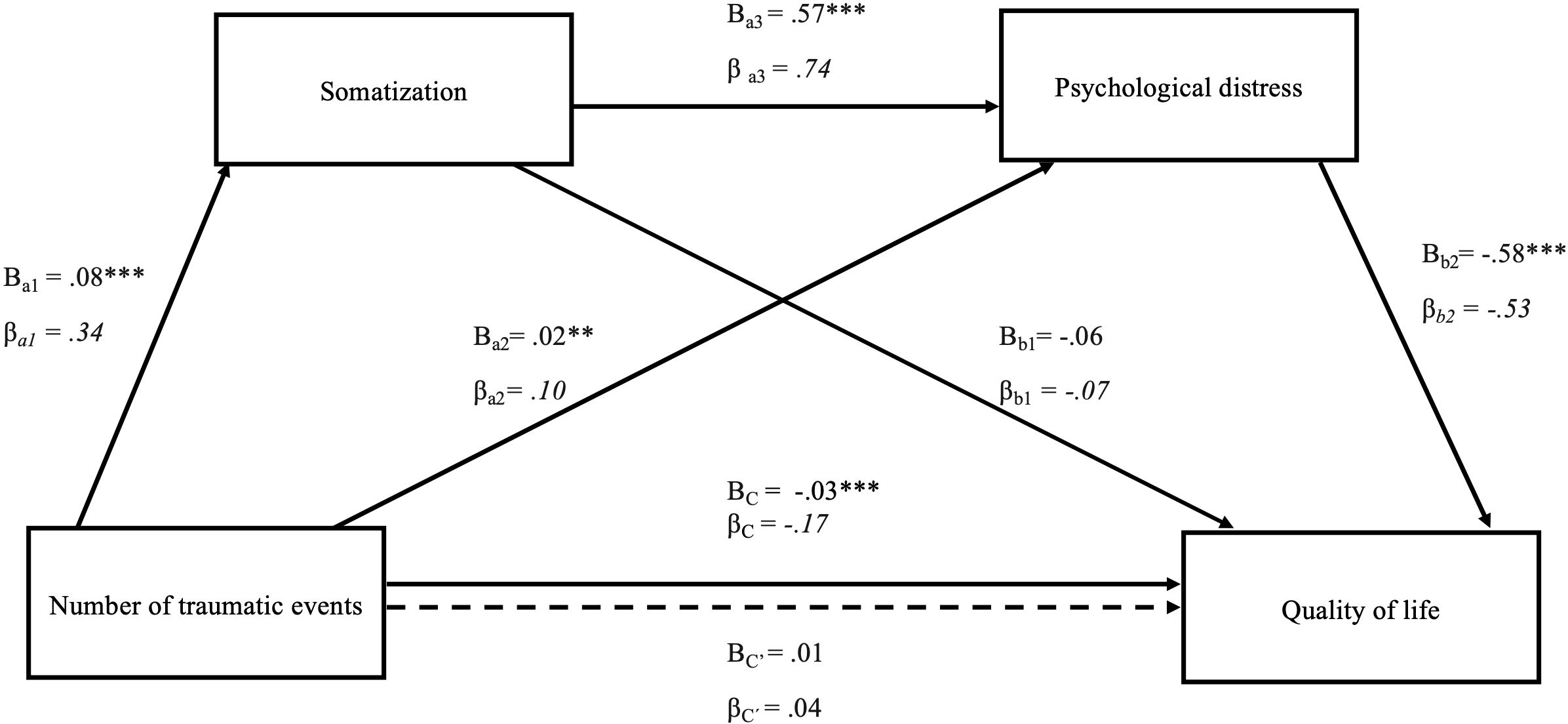 The same analysis replacing psychological distress with somatization (see Figure 2) showed that the direct effect of traumatic experiences on somatization, B = 0.08, SE = .01, t(550) = 8.19, β = .34, p < 0.001 was significant. This suggests that somatization increased with the number of traumatic events. Somatization as a first mediator was associated with higher psychological distress, B = 0.57, SE = .02, t(549) = 27.19, β = .74, p < 0.001, which finally acted as a second mediator B = -.58, SE = .07, t(548) = -8.65, β = .53, p <.001, resolving in a serial mediation between the number of traumatic events and quality of life, indirect effect (a1 a3 b2): B = -0.03 95% CI [-.034, -.017], β = -.13.