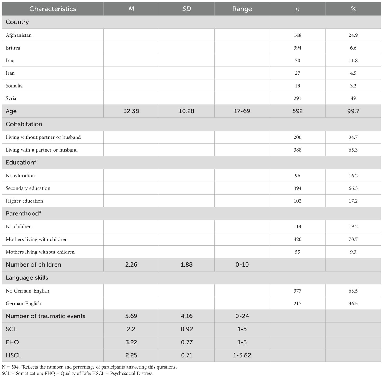 We included 594 women in the final analyses. Most came from Syria (49.0%, n=291) and Afghanistan (24.9%, n= 148). The participant’s mean age was 32.38 years (SD = 10.28). 80% (n=475) of the women stated they have children. 65.3% (n=388) of the women lived together with their husband or partner. 66.3% had attended school or had vocational training, 17.2% started or finished their studies or had a doctorate. 217 women spoke English, German, or both languages (see Table 1).