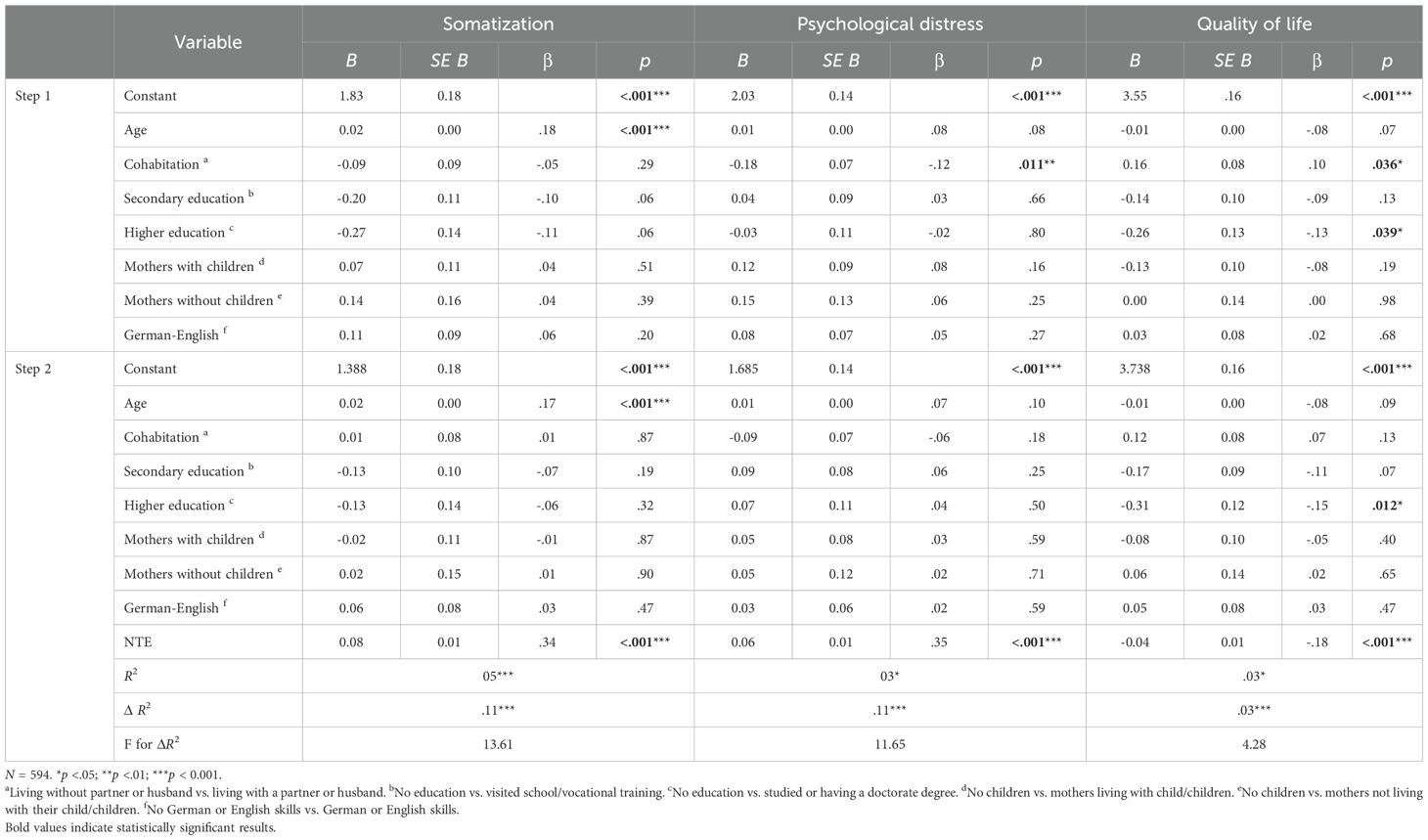 Separate hierarchical multiple regression analysis was performed to examine the predictive value of demographic variables and the number of traumatic events in somatization, psychological distress, and quality of life (Table 2). In step 1, we entered the predictor variables age, cohabitation, secondary education, higher education, mothers with children, mothers without children, and German/English skills. These variables explained 5% of the variance of somatization, F(7, 577) = 4.60, p <.001. In step 2, the number of traumatic events (NTE) was a significant positive predictor and explained an additional 11% for somatization, F(1, 576) = 72.76, B = 0.08, β = .34, p <.001, Δ R2 = .11. Age remained significant in both steps.