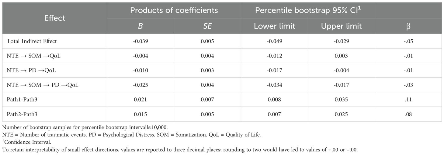 The statistical significance or non-significance of indirect effects are presented in Tables 3, 4. They present the specific indirect effects of the number of traumatic events through somatization and psychological distress on quality of life. To compare the specific indirect effects of the two significant paths, NTE-SOM-PD-QoL and NTE-PD-QoL from model 2, the specific indirect effect contrast is presented in Table 4. This contrast shows if the two paths differ significantly based on a percentile-corrected confidence interval of 95%. Since zero is not contained in the interval, the two indirect effects can be distinguished. The mediating role of psychological distress alone was weaker than the serial multiple mediation role of somatization and psychological distress together.