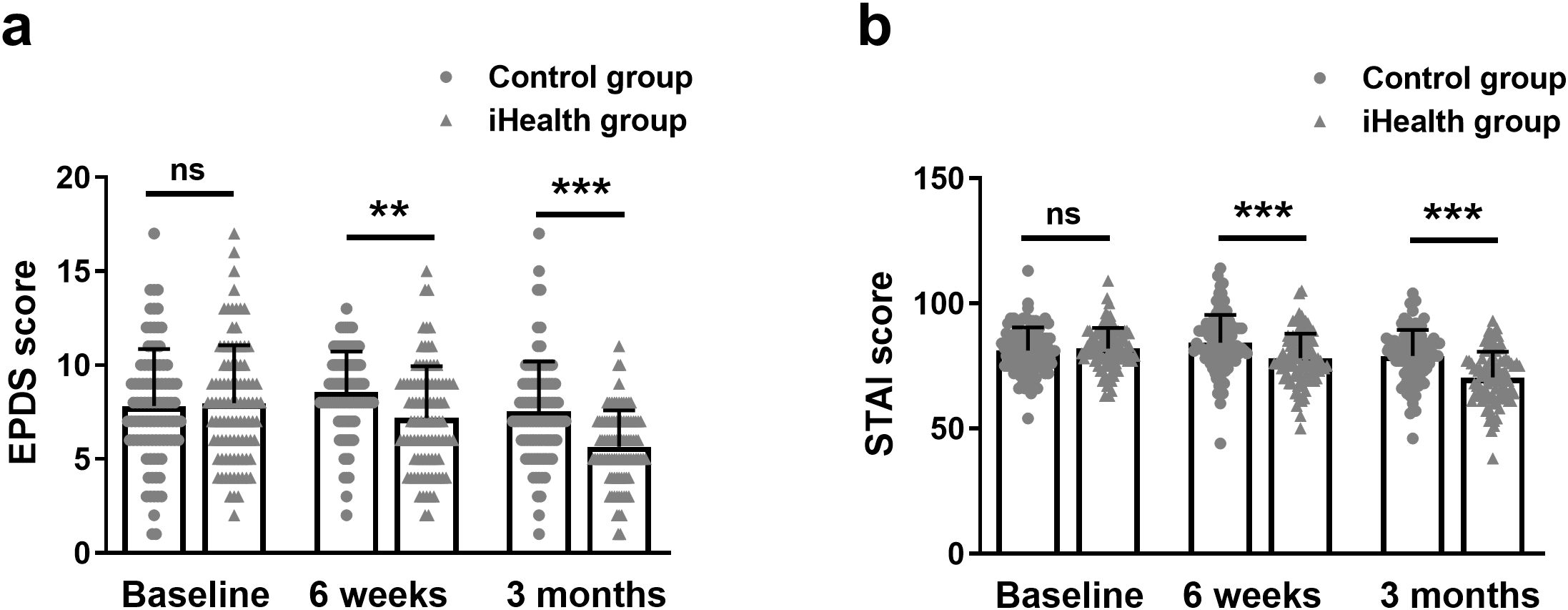 Change in EPDS (a) and STAI (b) scores between the iHealth and control groups among mothers at baseline, 6 weeks and 3 months postpartum. Data were shown as mean ± SD. **p<0.01, ***p<0.001 from Mann-Whitney test. EPDS, Edinburgh Postnatal Depression Scale; STAI, State-Trait Anxiety Inventory. ns, no significance.