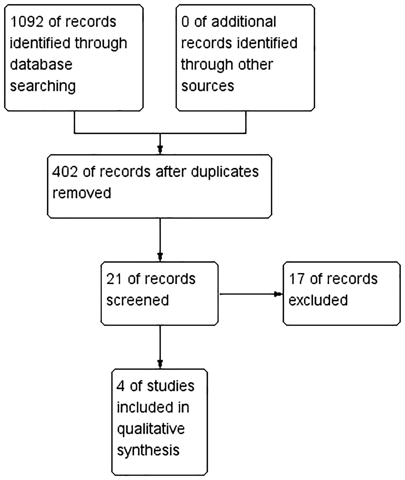 Figure 1 shows the flowchart of the study selection process. After the initial review of titles and abstracts, 402 studies remained after removing duplicates. Upon further examination of the abstracts, 21 studies met the preliminary screening criteria, and ultimately, 4 studies (16, 18, 28, 37) were selected for analysis after reviewing the full texts again.