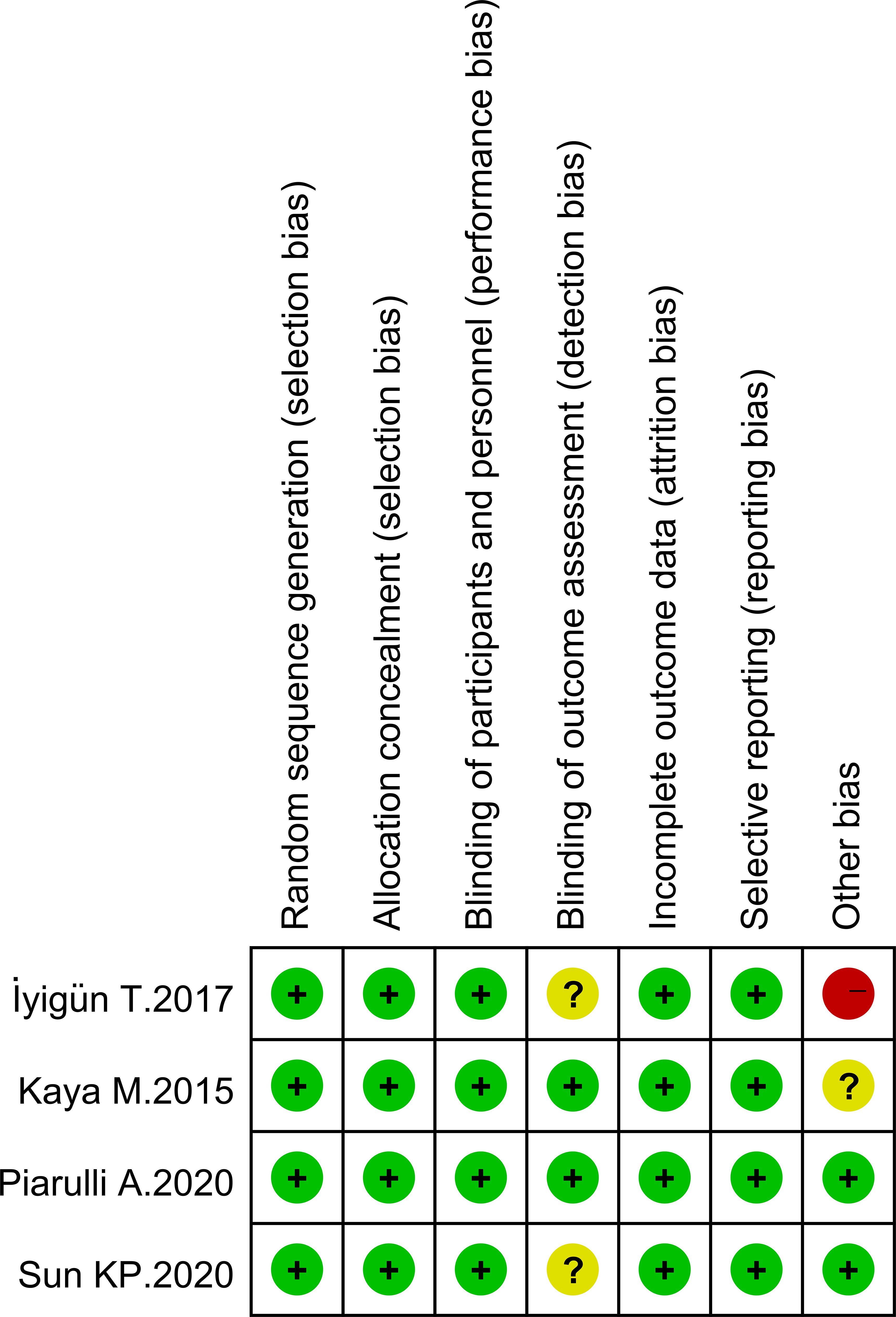 The analysis compared the baseline status of patients in four studies. Figures 2, 3 show tables outlining the “risk of bias in included studies.” A detailed description of the study features can be found in the section labeled “Features included in the study.”
