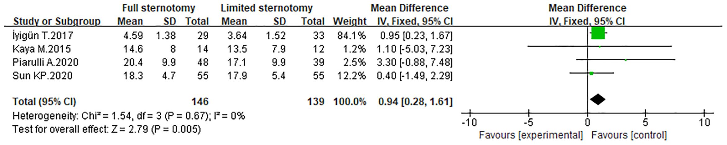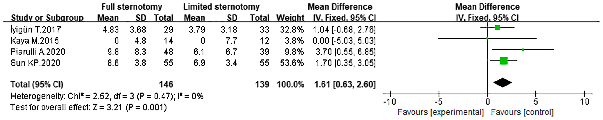 All four studies compared the scores 6 months after cardiac surgery. There was no heterogeneity between the two groups of studies (I2 = 0%). The scar after cardiac surgery in the full sternotomy group was significantly smaller than that in the limited sternotomy group (OR 0.94 [95% CI 0.28-1.61]; P = 0.005) (see Figure 4).