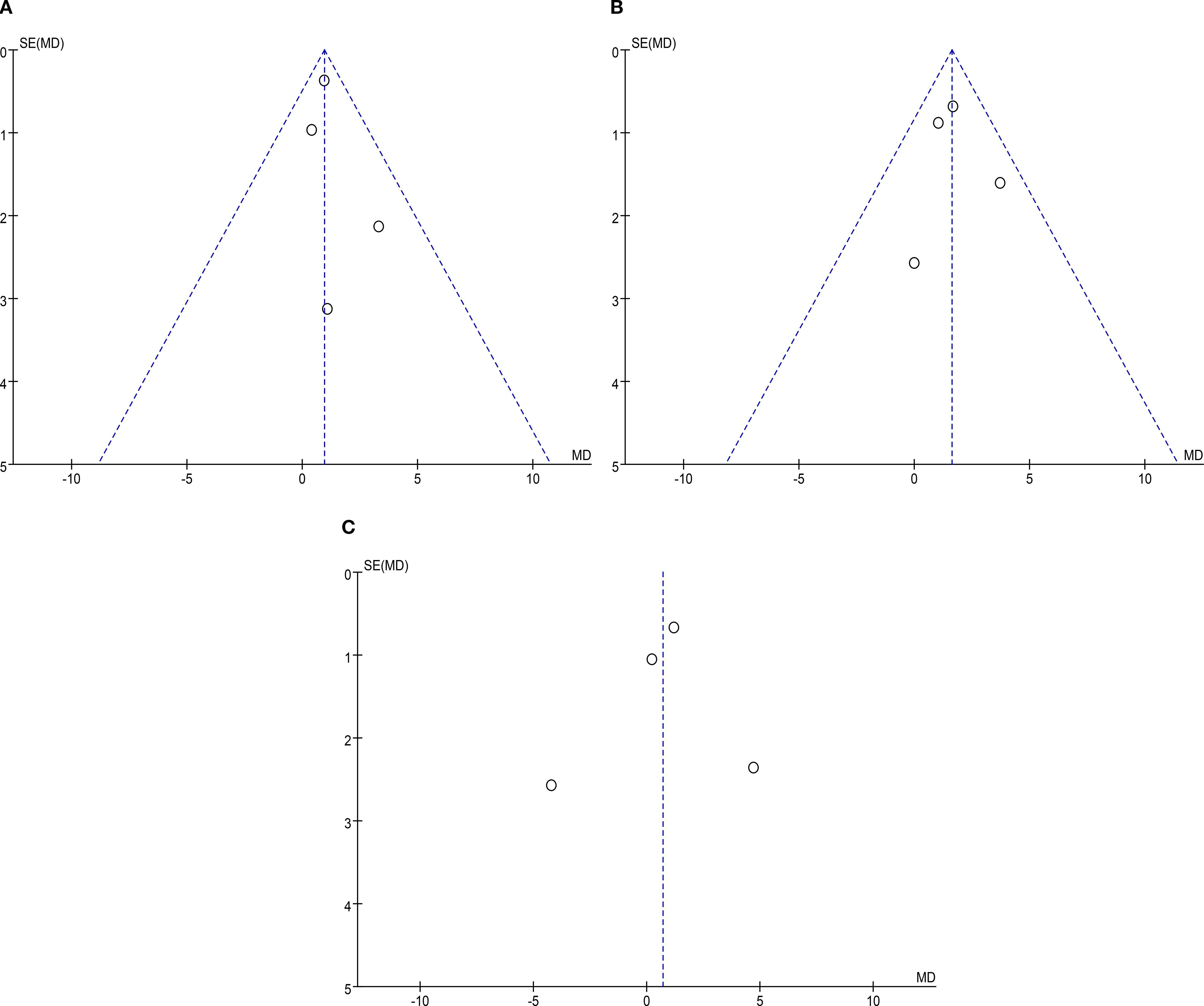Figure 7. The funnel plots of each outcome. (A) Scar comparison; (B) Depression scores; (C) Anxiety scores.