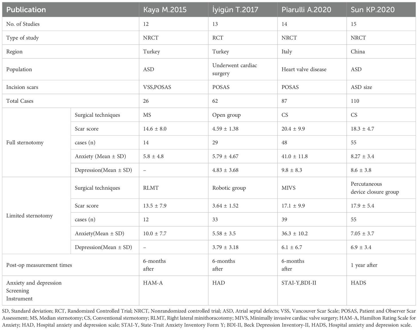 Compared with traditional full sternotomy, limited sternotomy has a smaller incision, shorter scar length after surgery, and may have less impact on patients’ anxiety and depression (12, 23, 27, 35). This meta-analysis included 285 patients who underwent cardiac surgery, 146 of whom underwent full sternotomy and 139 who underwent limited sternotomy. Full sternotomy had a smaller scar score than Limited sternotomy (OR = 0.94 [95% CI 0.28-1.61]; P = 0.005), with no significant heterogeneity between the two groups (I2 = 0%); and the postoperative depression score of Full sternotomy group is higher than that of Limited sternotomy group (OR = 1.61 [95%CI 0.63-2.60]; P = 0.001), there was no significant heterogeneity between the two groups (I2 = 0%). However, there was no statistical difference in postoperative anxiety scores between the two groups (OR = 0.70 [95%CI 1.40-2.80]; P = 0.51). There was slight heterogeneity between the two groups (I2 = 58%), so a random effects model was used. This is basically consistent with previous research results (6, 11, 36). The results of this study further illustrate that patients with more severe postoperative scars have higher depression scores, but there is no significant difference in anxiety. Possible reasons for analyzing the analysis are that depression is often associated with persistent negative self-evaluation and hopelessness, and may be more closely linked to the long-term, stable nature of scarring. In contrast, anxiety tends to be acute and is associated with immediate threats or uncertainties (e.g., surgical recovery complications, short-term social judgments) that may decrease as patients adjust to postoperative life, regardless of scar severity. In addition, the number of studies and patients included in this meta-analysis was relatively limited.