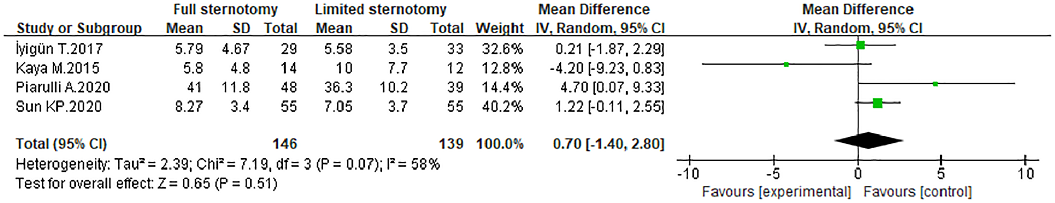 Forest map of anxiety scores between the full sternotomy group and the limited sternotomy group after cardiac surgery.