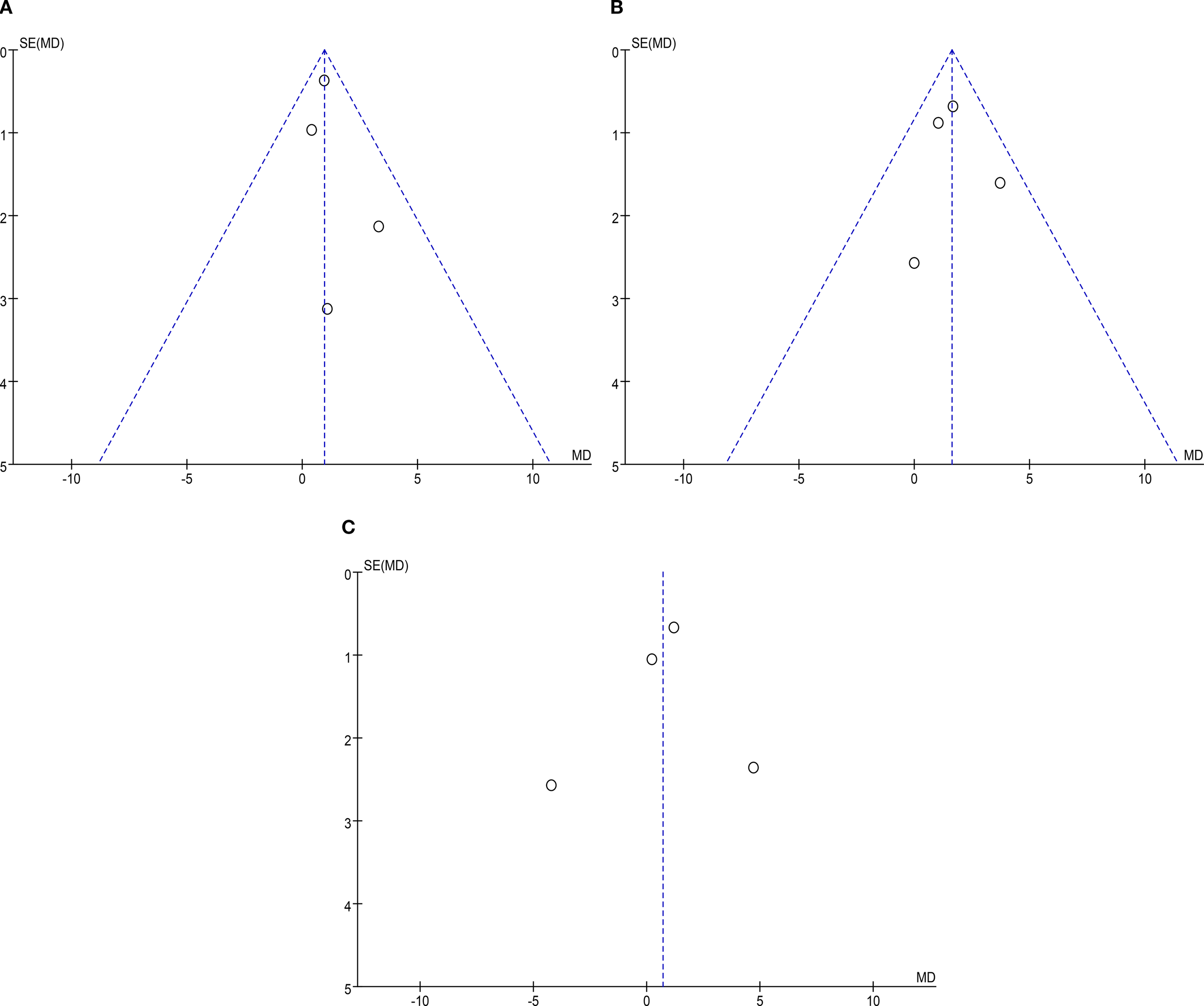 Funnel plots were employed to evaluate publication bias for each outcome. As illustrated in Figures 7A through 7C, the funnel plots exhibit good symmetry, with scatter points evenly distributed within the funnel. This suggests that publication bias is unlikely to significantly impact the results of the meta-analysis (see Figure 7).