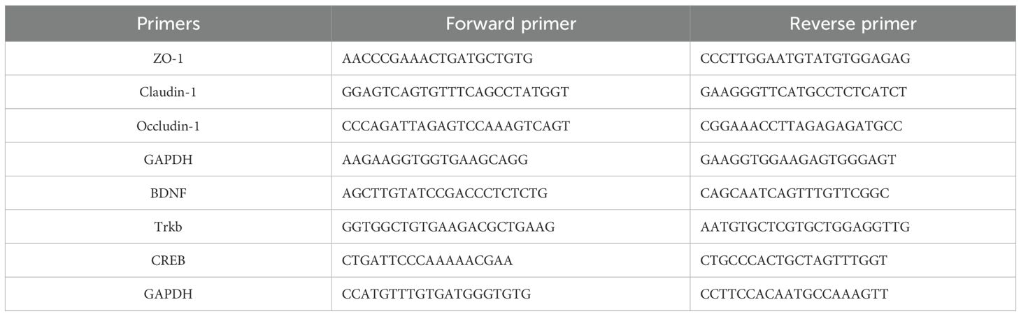 Referring to previous methods with appropriate modifications (45, 46), total RNA was extracted from isolated hippocampus and colon using QIAzol lysis reagent and purified with HiScript II Q RT SuperMix for qPCR (+gDNA wiper) (Vazyme Biotech Co., Ltd). cDNA was synthesized from total RNA with a high-capacity reverse transcription kit (Life Technologies). cDNA was then amplified using Taq Pro Universal SYBR qPCR Master Mix (Vazyme Biotech Co., Ltd), noted for good specificity, high sensitivity, and high amplification yield. qPCR was performed using the CFX96 real-time system (Bio-Rad, USA). Relative quantification was carried out using the ΔΔCT method. Primers were designed and synthesized by Beijing Kengke Biotechnology Co., Ltd (Table 1).