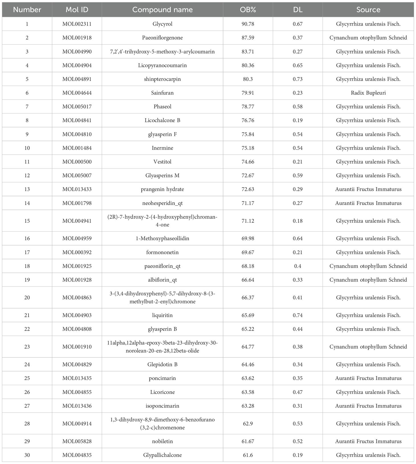 The Traditional Chinese Medicine Systematic Pharmacology Database and Analysis Platform (TCMSP) was used to identify active ingredients of Radix Bupleuri, Paeoniae Radix Alba, Aurantii Fructus Immaturus, and licorice. Oral bioavailability (OB) ≥30% and drug-likeness (DL) ≥0.18 were applied as screening criteria (26). Active ingredients were further validated using the PubChem database (organic small molecule activity) and the SwissTargetPrediction database (small molecule drug target prediction). The potential targets of the active ingredients of Sini San were then retrieved.