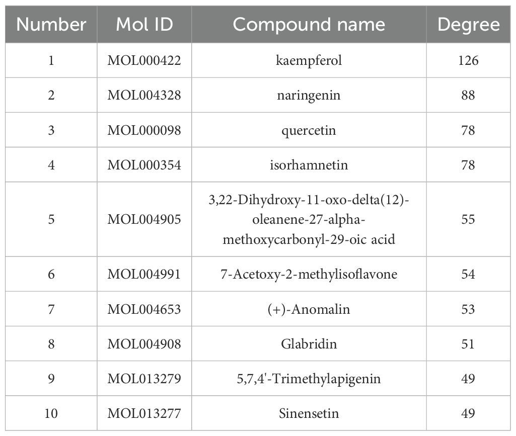 The collected drugs, their active ingredients and targets, as well as the intersecting potential targets, were imported into Cytoscape 3.9.1 to construct a “traditional Chinese medicine–active ingredient–target” network. Core ingredients were analyzed, and the degree value of each active ingredient was obtained through topological analysis.