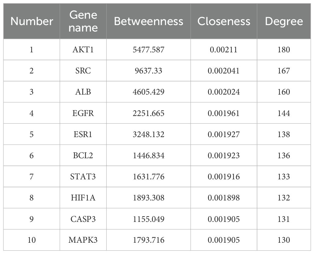 The intersecting targets were imported into the STRING database, with “Homo sapiens” set as the species. A protein–protein interaction (PPI) network was constructed using a confidence score ≥0.9 (27). The resulting TSV files were imported into Cytoscape 3.9.1, and PPI network topology was analyzed using the CentiScaPe 2.2 plug-in. Core targets of Sini San in depression were obtained by screening based on topological parameters, including closeness centrality, betweenness centrality, and degree centrality.