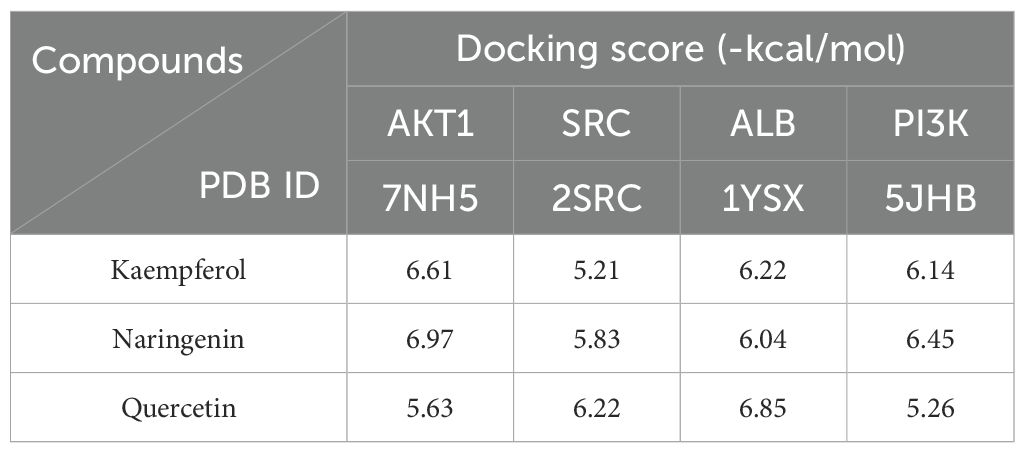KEGG analysis indicated that cancer-related and chemical carcinogenesis–receptor activation pathways had the highest enrichment scores, suggesting a close association with depression. The PI3K/AKT signaling pathway was visualized as a key pathway (Figures 2A–C). Active ingredients kaempferol, naringenin, and quercetin were docked with core targets (AKT1, SRC, ALB) and pathway protein PI3K using AutoDock Vina software (Figure 2D). The binding energies (Table 5) were all ≤ −5 kcal/mol, with the lowest between naringenin and AKT1 (−6.97 kcal/mol), indicating the strongest binding.
