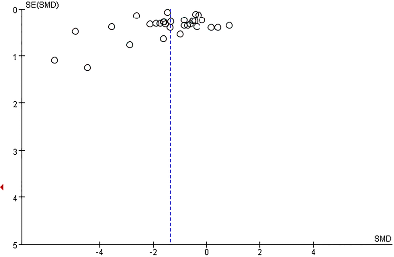 The effect of the intervention measures was compared with that of the control group. A meta-analysis was conducted on 32 studies. The overall result is shown in Figure 3. Compared with the blank control group, exercise intervention had a significant effect on improving mobile phone addiction in adolescents [SMD= -1.38, 95%CI (-1.75, -1.01), p < 0.001], and I2 showed significant heterogeneity (I2 = 94%, p < 0.001).