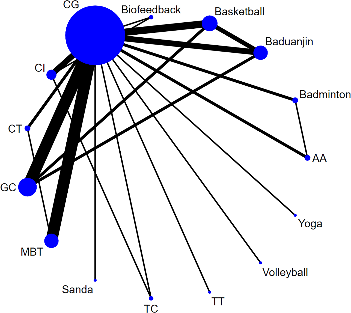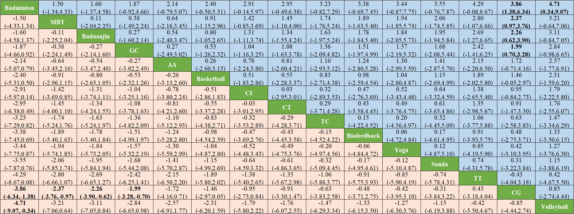 | Interventions | Aerobic Aerobics (AA), Badminton, Baduanjin, Basketball, Biofeedback, Tai Chi (TC), Table tennis (TT), Jump rope (JR), Combined Intervention (CI), Mindfulness-Based Therapy (MBT), Cognitive Therapy (CT), Sanda, Volleyball, Yoga | |