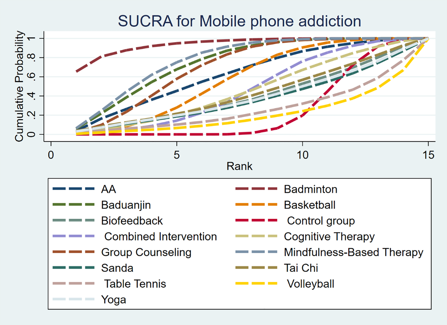 This study employed network meta-analysis to evaluate the impact of several exercise interventions on mobile phone addiction. The aim is to determine the most effective exercise intervention measures and provide a reference for future intervention measures to improve mobile phone addiction.