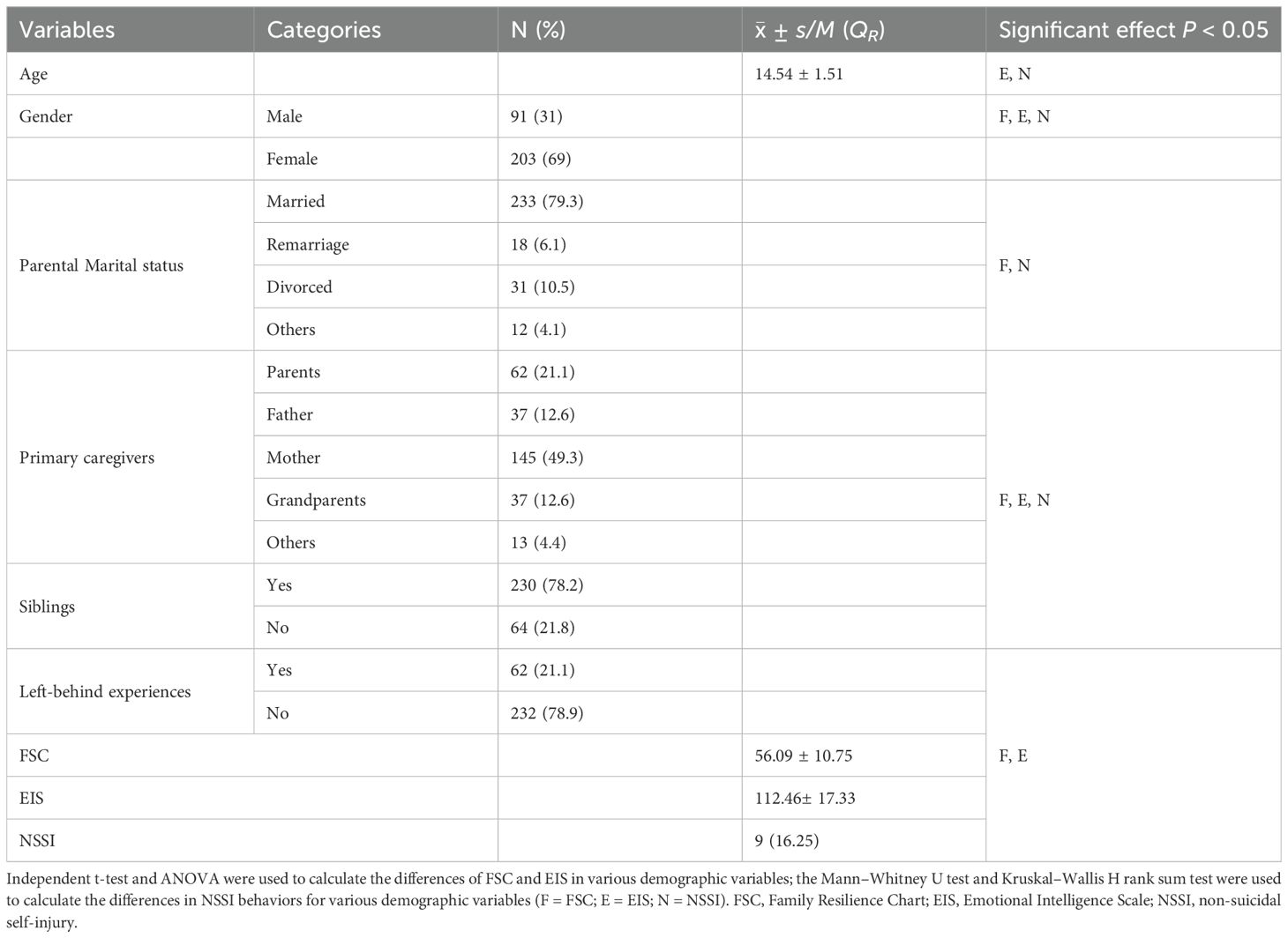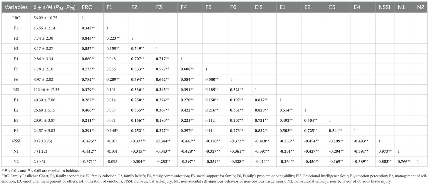 Preliminary data analyses were conducted using SPSS 25.0® (IBM, Armonk, NY, USA). All variables were entered into Excel by two authors and processed and statistically analyzed using SPSS. All variables showed complete data, thanks to strict data collection measures. Normally distributed data were expressed as ± s. For comparison of differences between groups when the groups show normal distribution, the chi-square test and independent samples t-test were used. One-way analysis of variance (ANOVA) was used for multi-group comparisons. When continuous variables were non-normally distributed, M(QR) was used to describe the statistic, and non-parametric test was used for comparing between-group differences. The Mann–Whitney U test was used for comparing two independent samples, and the Kruskal–Wallis H rank sum test was used for comparing multiple independent samples. The Dunn’s method was used for two-by-two comparisons when between-group differences were identified. Correlation analyses between scores were performed using the Spearman’s correlation coefficient. Latent variable structural equation modelling (SEM) was used to analyze the mediating effect of emotional intelligence on the relationship between family resilience and NSSI behaviors. The Hayes PROCESS macro (Model 4) was used to test the mediating effect, with 5,000 bootstrap samples and the calculation of bias-corrected 95% confidence intervals (27). All modelling procedures were performed using IBM® SPSS® Amos™ 22 (IBM). The following indices determined the goodness of fit of the model: Chi-square ratio of degrees of freedom (χ2/df) < 2 and P > 0.05, the root mean square error of approximation (RMSEA) < 0.08, the Comparative Fit Index (CFI) > 0.90, the adjusted goodness-of-fit index (AGFI) > 0.90, the normed fit index (NFI) > 0.90, and the Tucker–Lewis index (TLI) > 0.90. A two-tailed P value of < 0.05 indicated significant difference.
