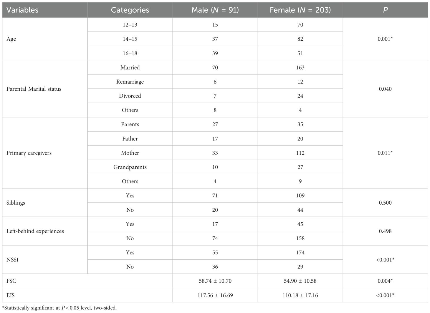 Sociodemographic characteristics of participants are shown in Table 1; the study cohort comprised 91 males (31%) and 203 females (69%) aged 12–18 years (mean ± SD = 14.54 ± 1.51 years). Overall, for 79.3% of the participants, their parents were in their first marriage, and for 49.3% of the participants, their primary caregiver was their mother. Most patients had siblings (78.2%), and 78.9% of patients had no left-behind experience.