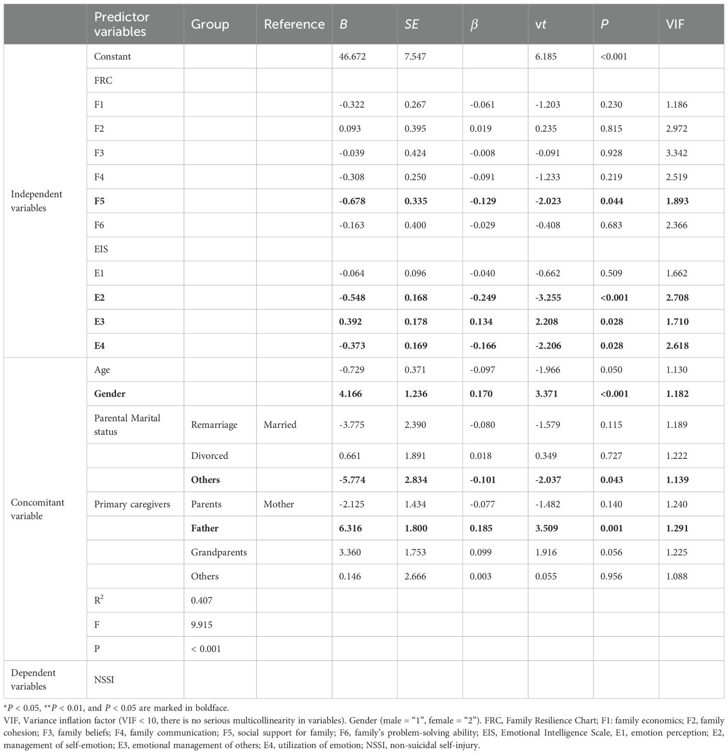On various dimensions of FSC, social support for family had a significant impact on NSSI. On various dimensions of EIS, management of self-emotion, emotional management of others, utilization of emotion had a significant impact on NSSI. Among the covariates, gender, parental marital status (married vs. others), primary caregivers (mother vs. father), According to the diagnostic analysis of covariance, there was no significant multicollinearity among family resilience, emotional intelligence, NSSI behavior, gender, parental marital status, and primary caregiver variables. The results are shown in Table 4.