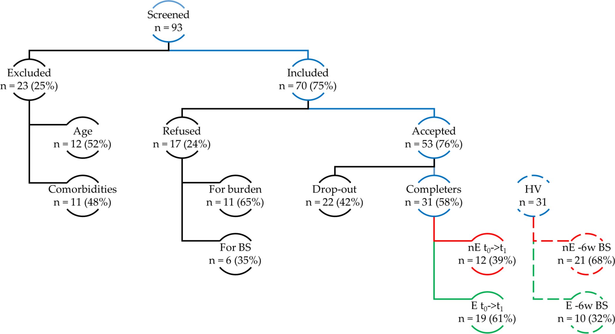 Figure 1. Flowchart of participants. A total of 93 patients were screened; 23 were excluded, and 70 passed screening. Among these, 17 declined participation. Of the 53 enrolled, 22 dropped out after baseline, leaving 31 completers: 12 nonexposed (nE) and 19 exposed (E) to greenery ≥40 min twice weekly. Additionally, 31 healthy volunteers (HV) participated: 21 nE and 10 E based on self-reported green exposure in the 6 weeks before blood sampling. Exposure was voluntary and self-reported. BS: blood sampling; HV: healthy volunteers; nE: nonexposed; E: exposed; t0→t1: baseline to six-week follow-up; –6w BS: six weeks before sampling.
