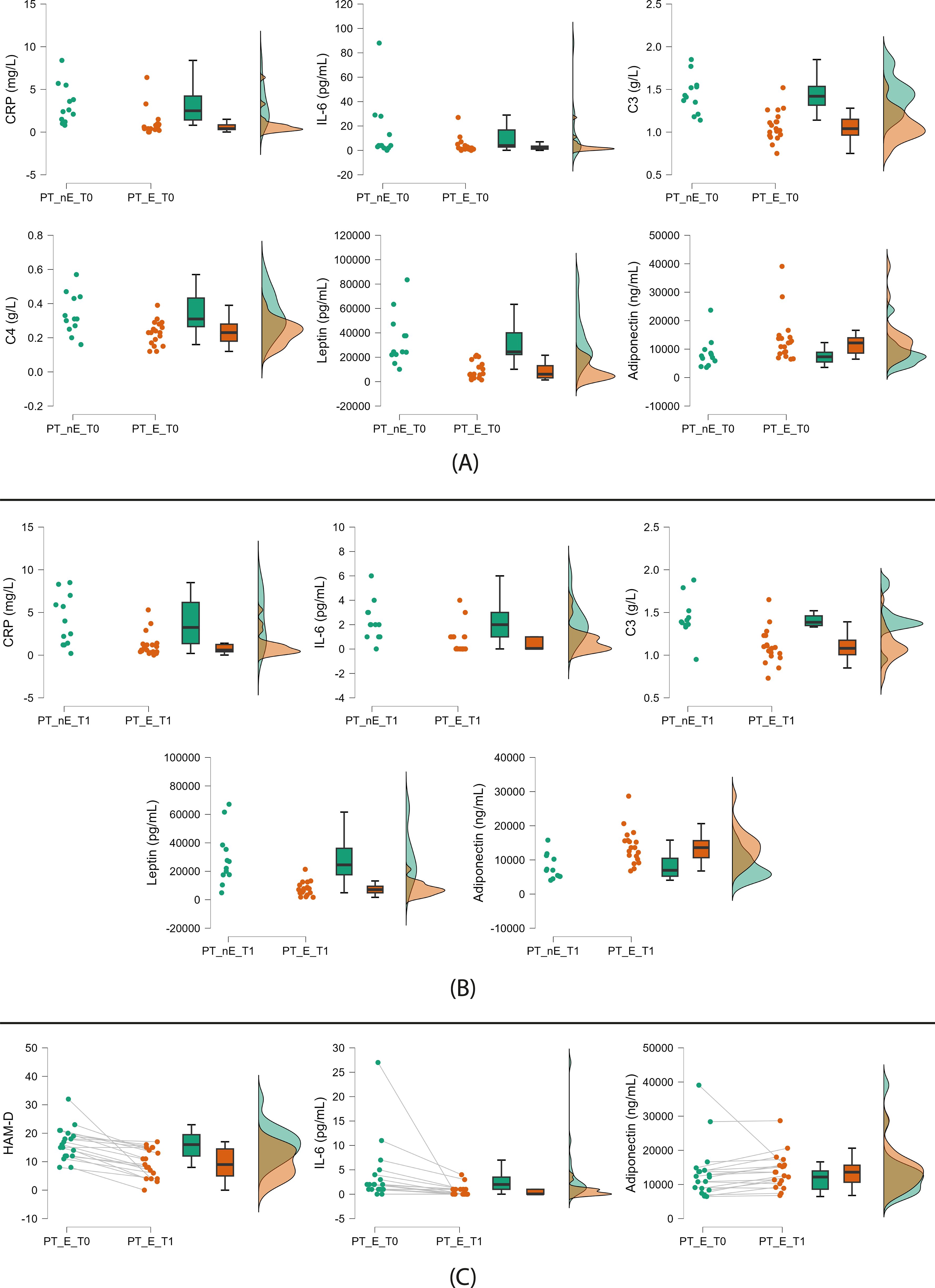 Figure 3. Significant trends between green-exposed and nonexposed HV and patients. (A) Nonexposed (left) vs green-exposed (right) healthy volunteers (HV); (B) Nonexposed HV (left) vs nonexposed patients (PT) (right) at baseline; (C) Nonexposed HV (left) vs nonexposed PT (right) at follow-up. HV: healthy volunteers; PT: patients; nE: nonexposed; E: exposed; T0: baseline; T1: follow-up. Green exposure (≥45 min twice weekly) is voluntary and self-reported. Raincloud plots display, from left to right, dot plots (raw data), box plots (median and interquartile range), and density plots (probability distribution and estimated density).
