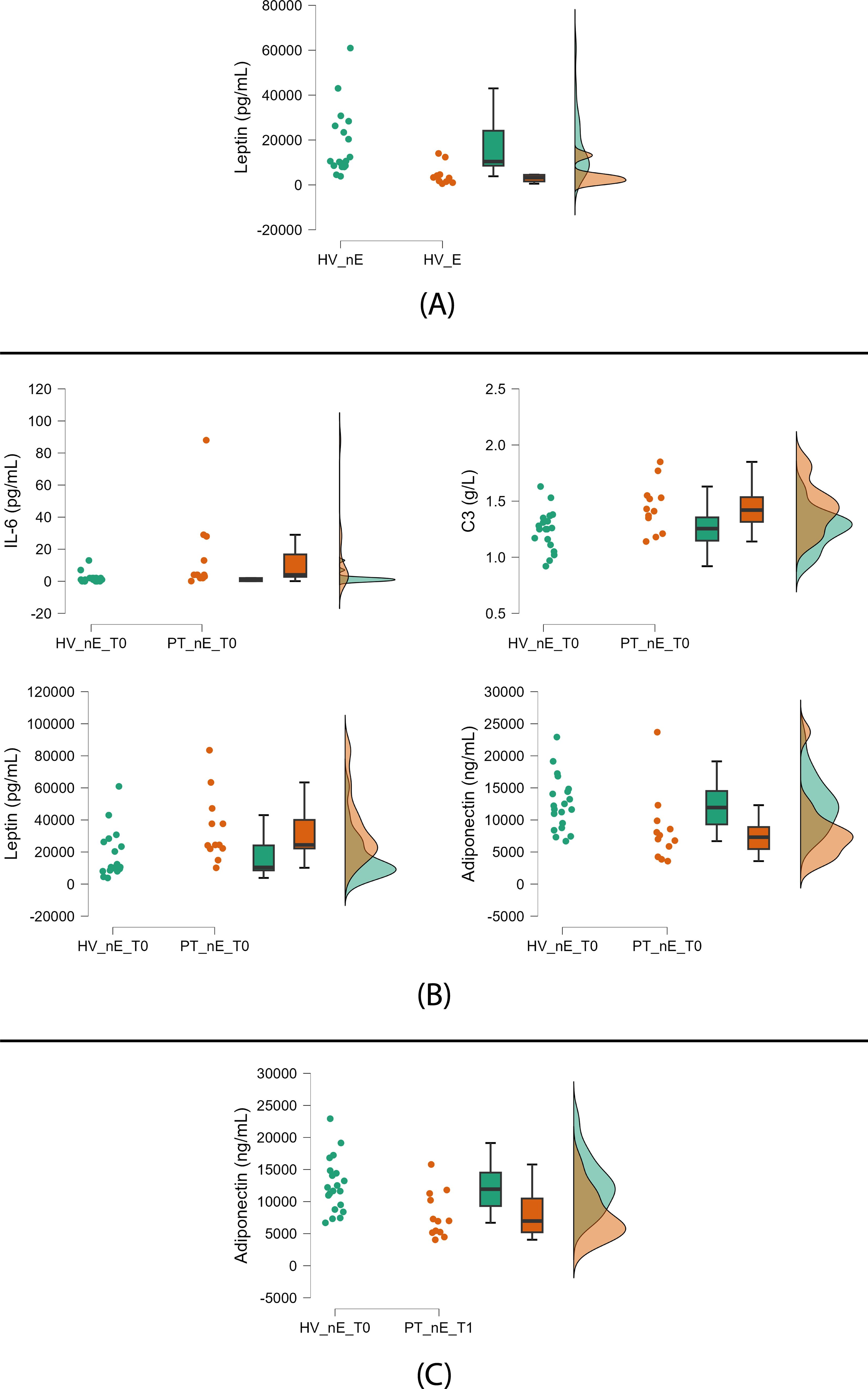 At baseline, nonexposed patients compared to nonexposed HV showed the following trends: higher levels of IL-6, C3, and leptin and lower levels of adiponectin (Figure 3B, Table 3).