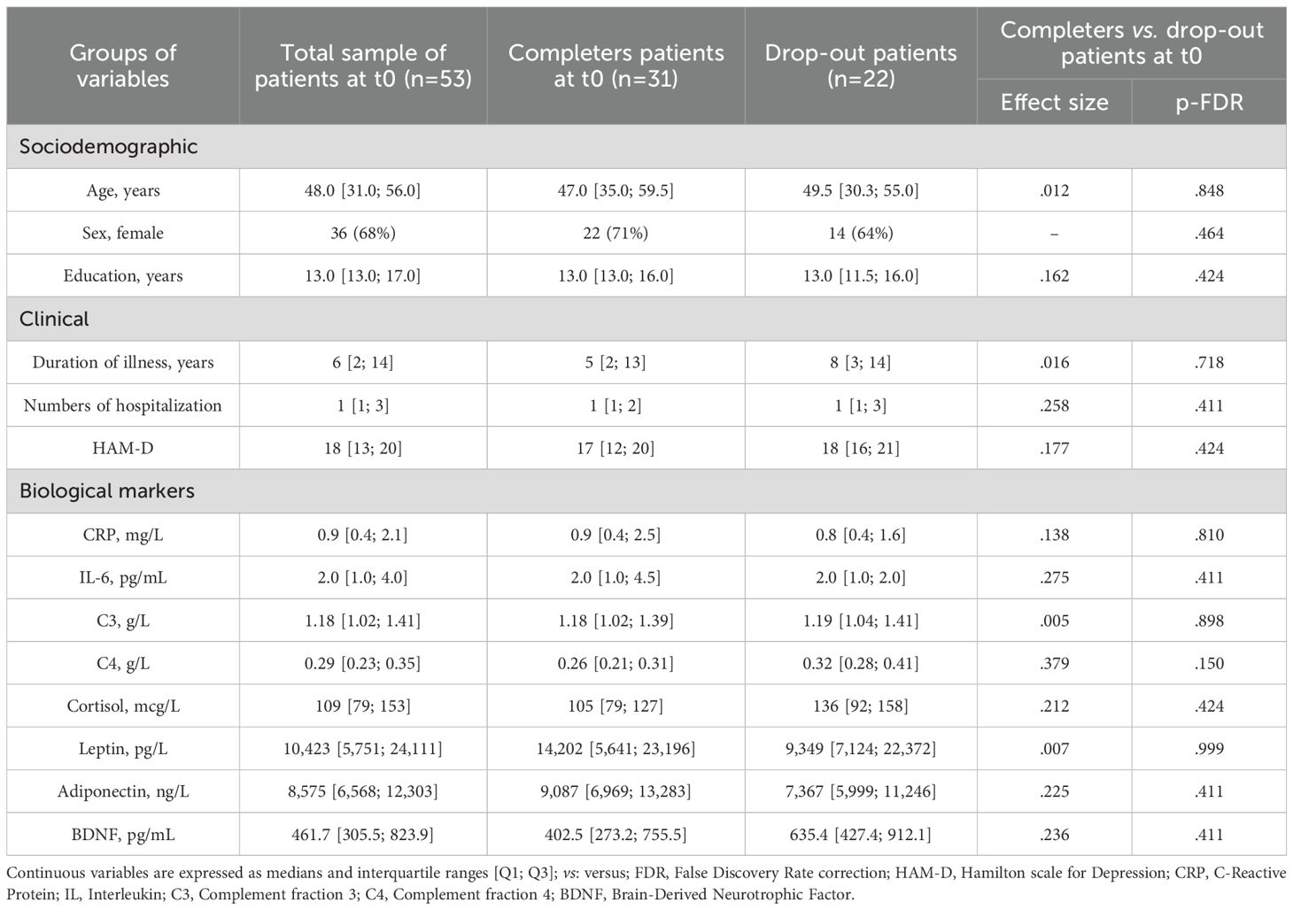 Sex-dependent distributions of completers and HVs’ variables are reported in Supplementary Material (Supplementary Figures 1, 2, Tables 1, 2). No trends were found after FDR correction.