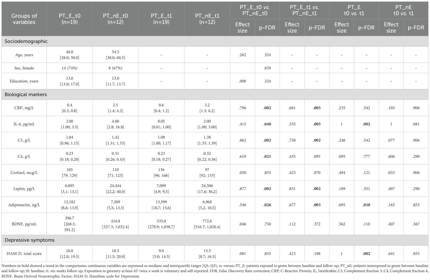Despite these limitations, this study has notable strengths. Unlike previous studies, which typically involve non-clinical populations, do not account for the specific phase of the illness, or focus on living in proximity to green spaces rather than exposure into them (56), this study is pioneering as the first to examine green space exposure in a clinical population (MDD and BD patients), during a specific phase of these disorders (MDE), in a real-world setting, showing that the majority of patients adhere to spending time in green spaces despite acute depression. We also show preliminary trends of improvements in depressive symptoms and inflammatory balance linked to self-reported adherence to an intervention of green space exposure. Additionally, the study’s holistic approach considers not only depressive symptoms but also factors related to inflammation, stress, metabolism, and neurotrophic factors and focuses on the human-nature interaction in terms of active exposure into green environments.