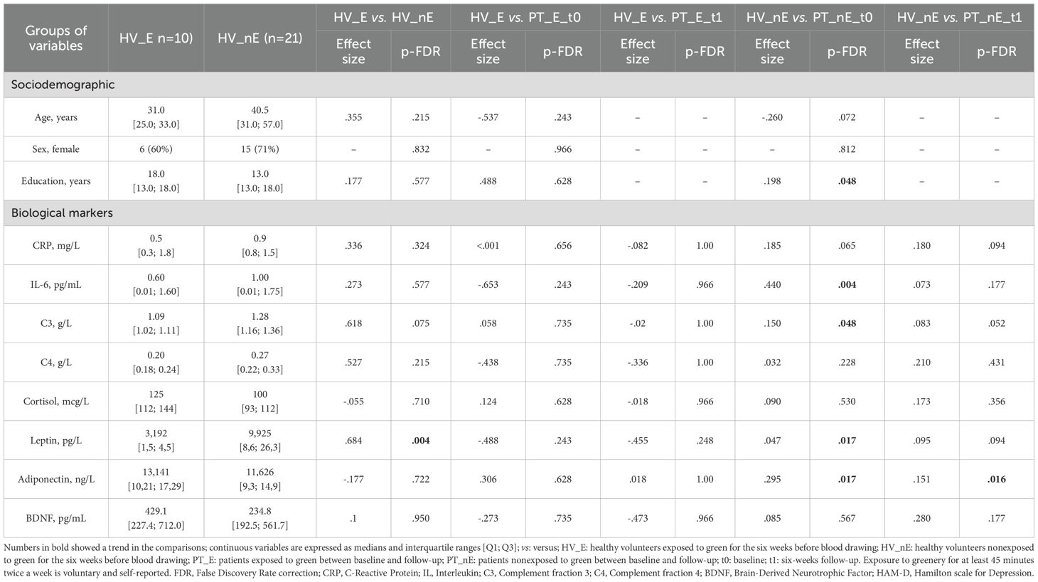 At baseline, patients were instructed to spend time in natural green environments. We defined green environments as all those areas with low anthropization that allow patients to be in contact with nature while distancing themselves as much as possible from the urban environment. Therefore, we considered green environments to be forests, woodlands, and extensive urban gardens or parks, allowing patients an immersive greenery experience through sight, hearing, and smell. This operational definition aligns with the Japanese concept of Shinrin-Yoku (62, 63, 65). We suggested patients be exposed to green environments for 45–60 minutes, three non-consecutive days per week, until the follow-up visit. Exposure was explained as simply spending time in nature without engaging in physical activity. Since no established scientific protocols recommended a specific duration of green exposure, we based our approach on the WHO Guidelines on Physical Activity and Sedentary Behavior, which advise at least 45 minutes of physical activity three times a week on non-consecutive days (86). Following this model, we similarly suggested a comparable frequency and duration for green exposure. HV’s data collection and blood sampling were only performed at one time point, since the only information regarding green exposure that was collected for this group concerned their usual habits, namely whether or not they had frequented green environments during the six weeks prior to recruitment.