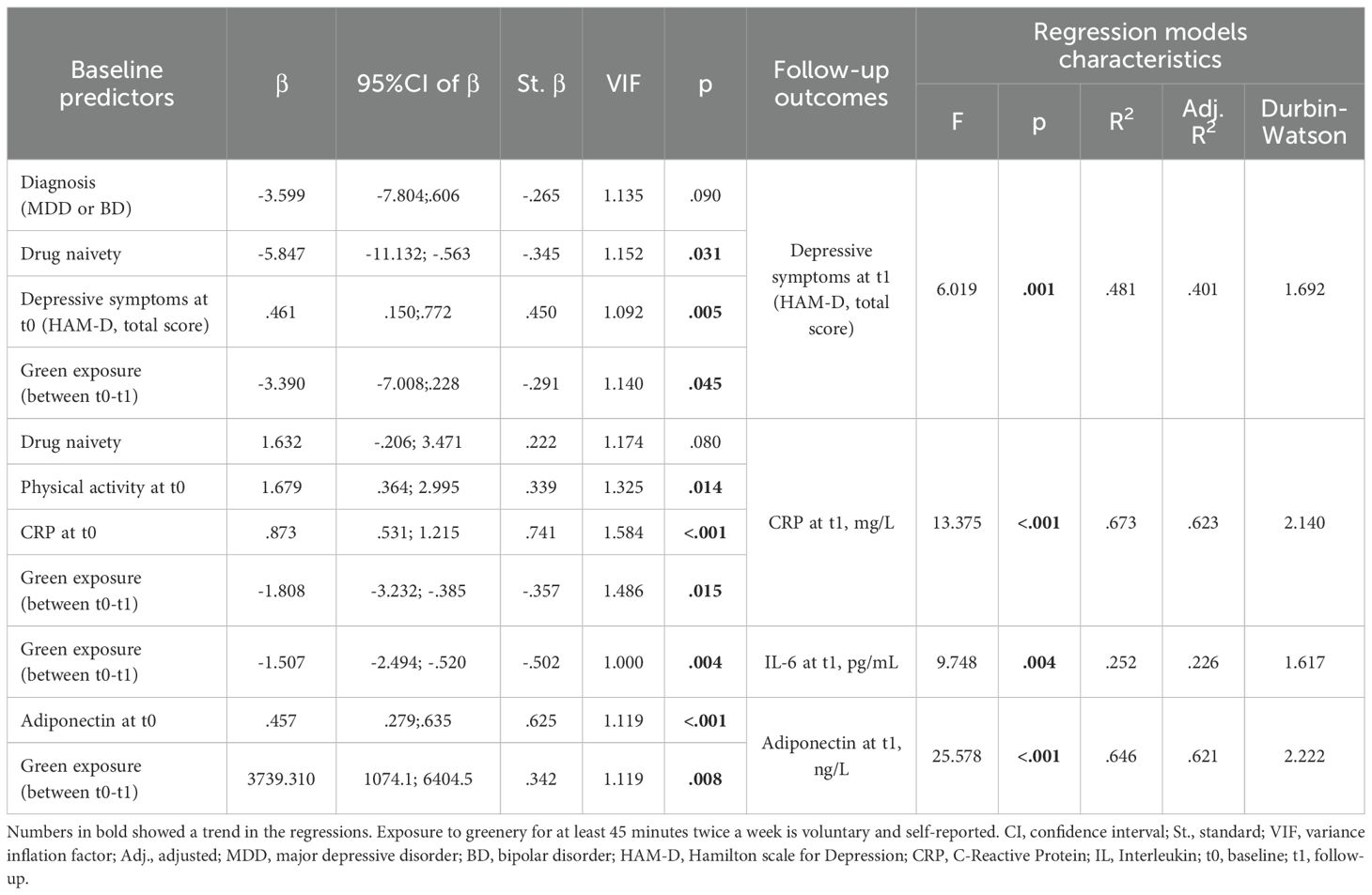 The significant results of the comparisons between exposed and nonexposed patients at follow-up (t1) and within exposed or nonexposed patients between baseline (t0) and follow-up (t1) were used to perform linear backward regression models. Follow-up (t1) variables showing a significant variation from the baseline in the between- and/or within-group comparisons were chosen as outcomes for the regression models. Exposure to green environments between baseline and follow-up was entered as the regressor into all regression models. The models were controlled for baseline (t0) diagnosis (MDD or BD), depressive symptoms, drug naivety, age, sex, education, body mass index (BMI), self-reported physical activity, and relationship with green, and for the baseline (t0) variable corresponding to the dependent follow-up (t1) variable. Regarding this latter control, for example, if IL-6 at follow-up (t1) was the outcome of the regression model, we controlled for IL-6 at baseline (t1) as an additional control variable. The regressor and control variables entered the regression model as independent variables.