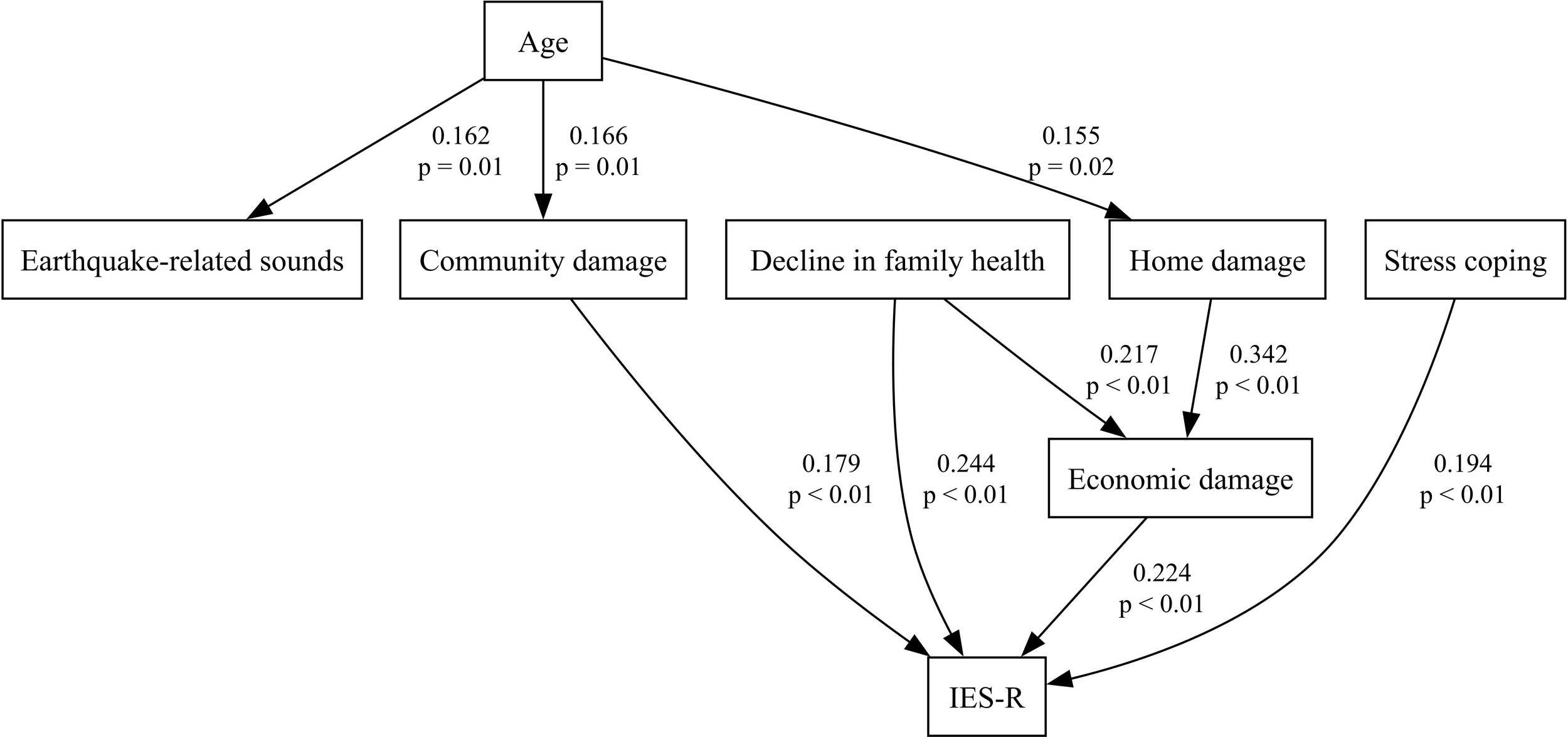 When considering the effects of multiple predictors in this way, univariate analyses, which cannot adjust for the influence of other variables, are often supplemented by multivariate methods such as analysis of covariance (ANCOVA) or multiple regression, both of which can handle several predictors simultaneously. However, these multivariate approaches treat all variables at the same hierarchical level and therefore cannot decompose and test causal pathways (direct versus indirect effects), potentially underestimating or omitting the influence of certain factors. Most of the previous studies introduced earlier are either collections of univariate analyses or regression and analysis of variance methods that analyze multiple variables on an equal footing. Ganime Can Gür (13) and Jiuping Xu et al. (18) employed hierarchical multiple regression, a technique in which predictors are entered in blocks by theoretical hierarchy so that residual variance not explained in earlier blocks is accounted for in subsequent blocks. Newnham et al. (3) used a latent growth curve model, which is designed to capture change over time rather than to detect indirect effects. We hypothesized that personal characteristics may influence post-trauma characteristics through complex interdependencies that ANCOVA alone cannot capture. Although our design is cross-sectional and cannot establish definitive causality, we conducted path analysis to define and quantify indirect pathways, thereby accounting for hierarchical interdependencies among predictors.