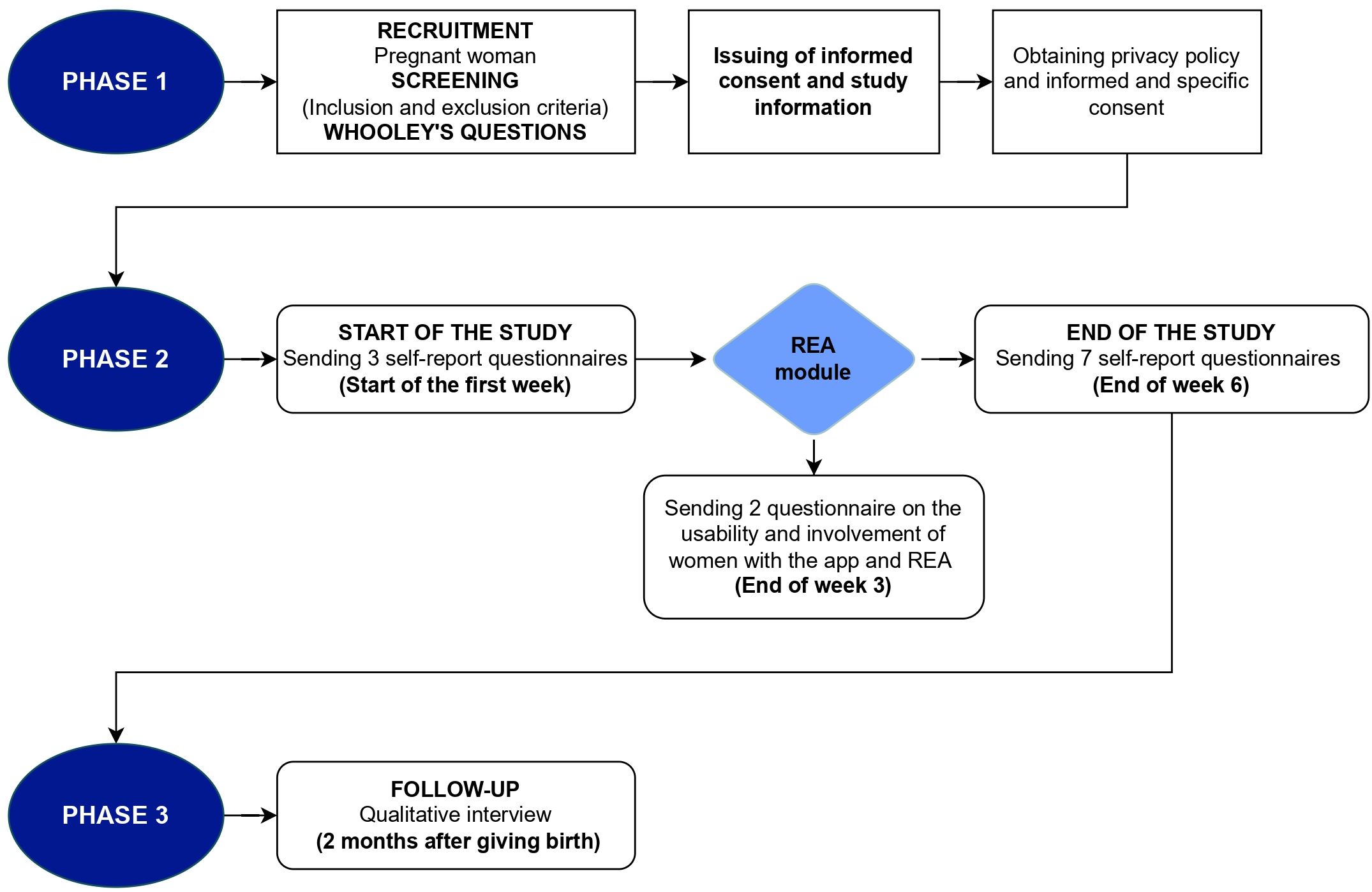 In summary, there is a need for scalable solutions that support perinatal mental wellbeing and reduce barriers to access. In consideration of the ACT theoretical rationale and the WHO framework on mental health promotion, the REA protocol is hereby presented. The REA protocol is a virtual coach integrated into TreC Mamma that delivers an 8-week psychoeducational program during the perinatal period. In the ensuing sections, we delineate the objectives, methodologies, metrics and analyses employed to evaluate its acceptability, feasibility, usability and engagement, in addition to pre-post psychological changes.