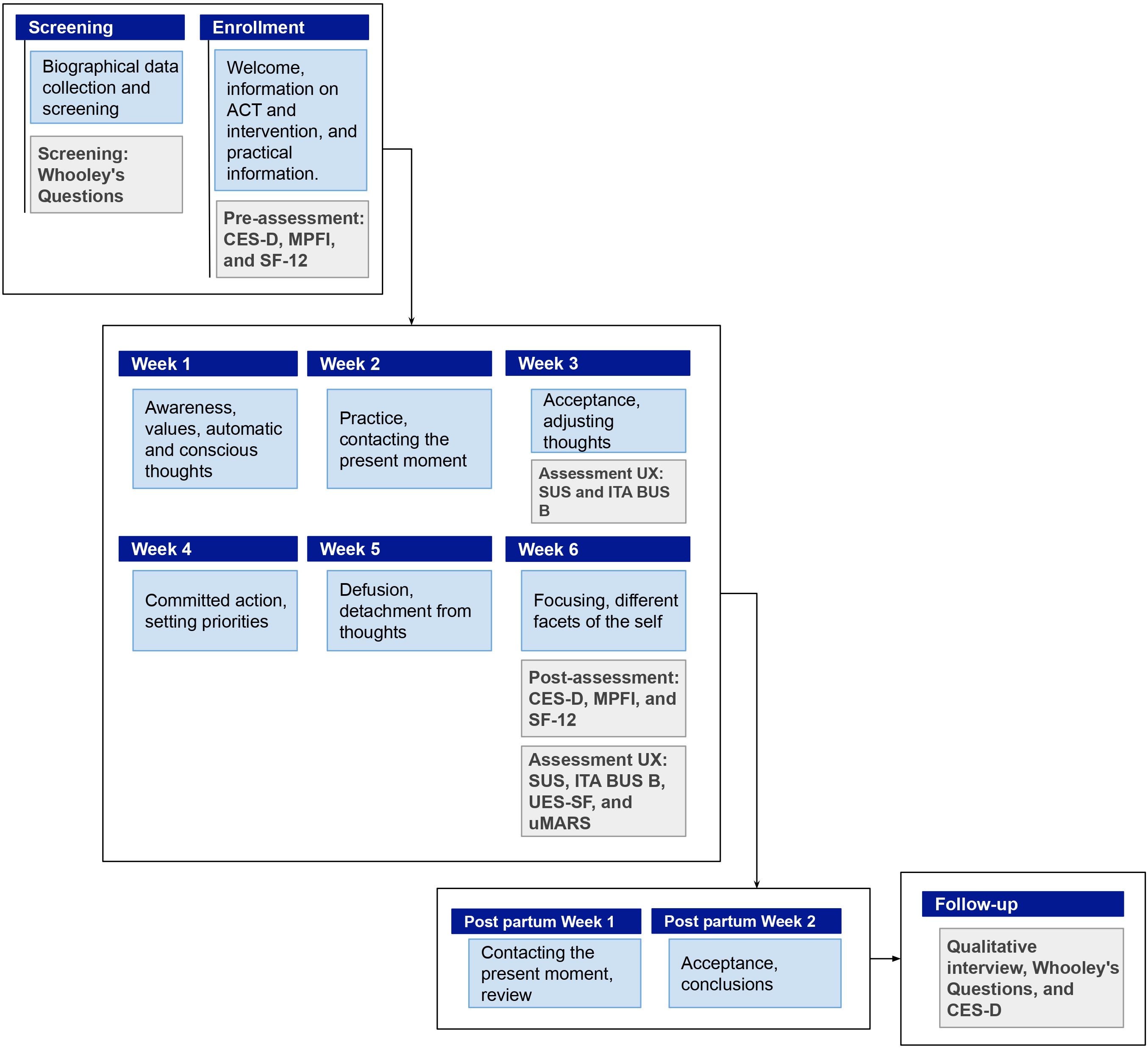 In the case of PPD, the intense stress and changes after childbirth can lead to unexpected and disturbing thoughts or feelings. While some fusion with thoughts may not be harmful, fusion with unfamiliar or distressing experiences, such as “I wish I did not have this baby”, can have serious consequences. If the mother avoids or believes these thoughts, she may feel guilty or disconnected from her baby. Even if someone is not fully fused with all their thoughts, they might still strongly believe what they see or hear. This becomes problematic when those perceptions are false, such as in hallucinations. In PPD, hallucinations and delusions, especially auditory ones, are not uncommon (9). In this protocol, the term perinatal is employed to denote the entire continuum from pregnancy to the initial months following childbirth, a period that is characterized by vulnerability but also by opportunities for prevention. The intervention, which is administered during pregnancy, aims to enhance psychological flexibility, stress regulation and perceived well-being, thereby reducing the proximal risk factors for postpartum distress. Within this framework, the ACT-based digital intervention offers psychoeducational content and experiential practices to support perinatal adaptation and contribute to the prevention of postpartum distress and depression.